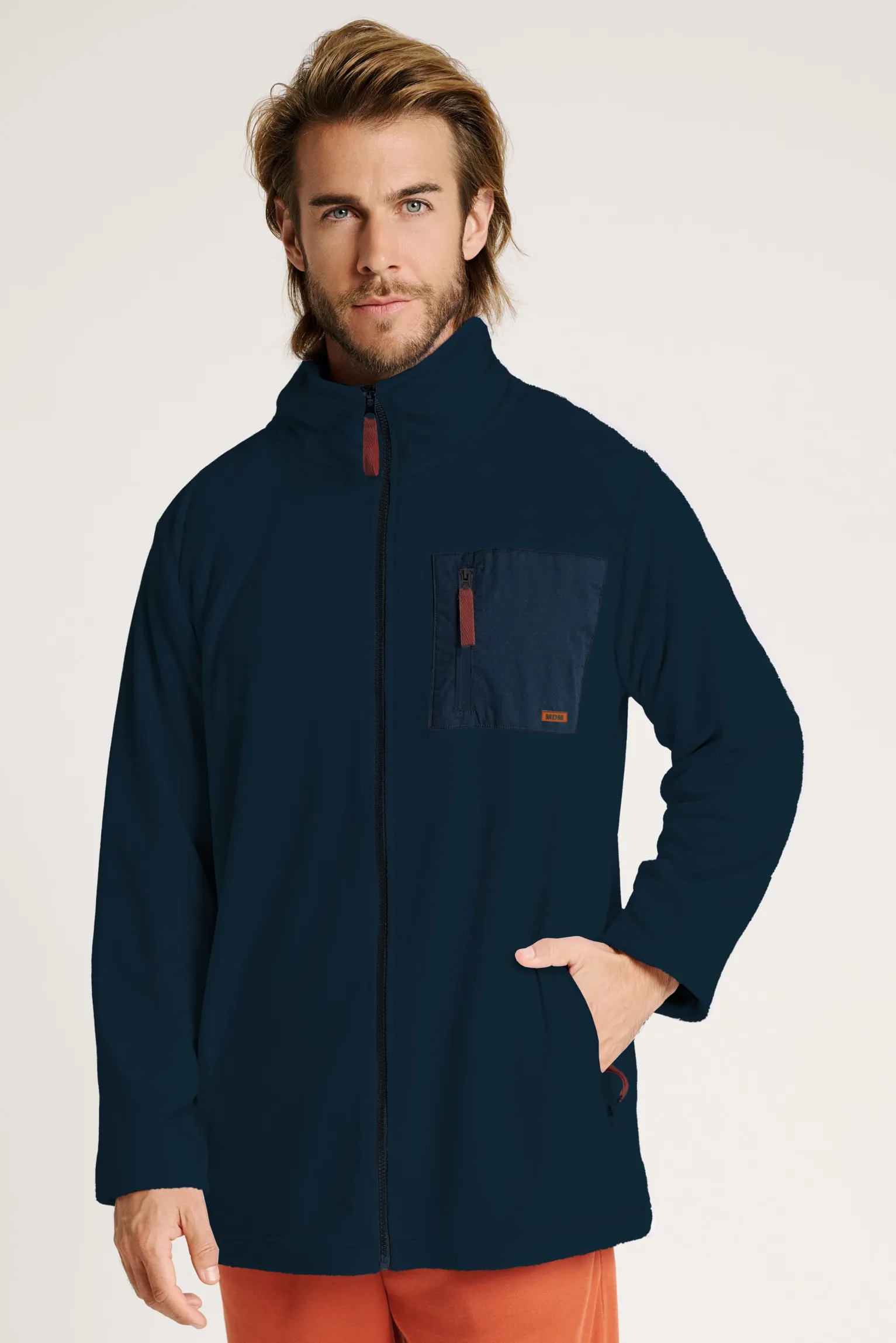 Esta bata de hombre con cremallera es la prenda ideal para los días de descanso en casa. Confeccionada en tejido polar suave, ofrece abrigo sin peso y una sensación envolvente muy confortable. Incluye bolsillos laterales funcionales y un bolsillo en el pecho a contraste, que le aporta un toque moderno y práctico.