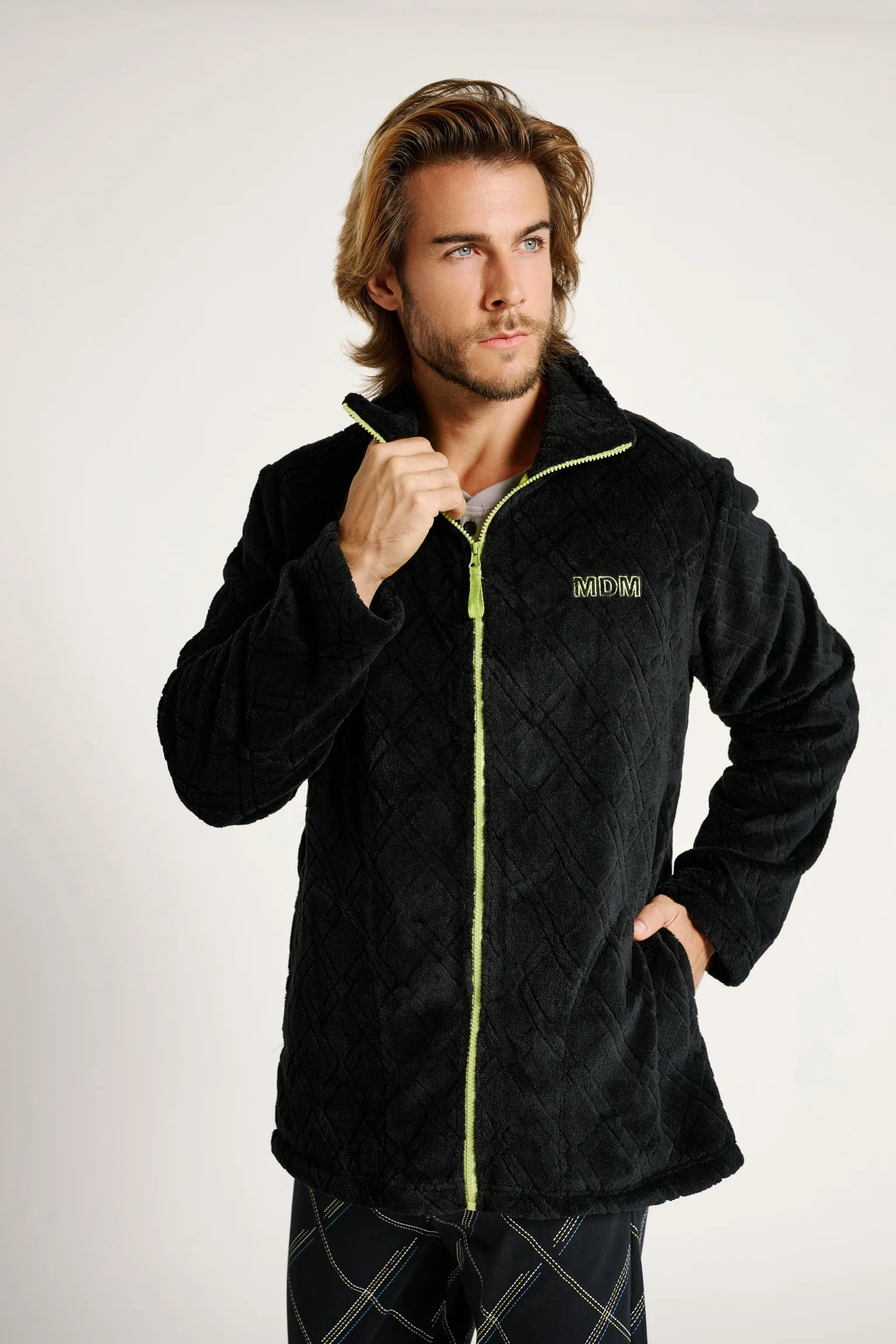 Esta bata polar de hombre destaca por su diseño moderno y su tejido suave con relieve de rombos. Confeccionada en tejido suave que ofrece una sensación cálida y cómoda ideal para el invierno. Perfecta para relajarte en casa.