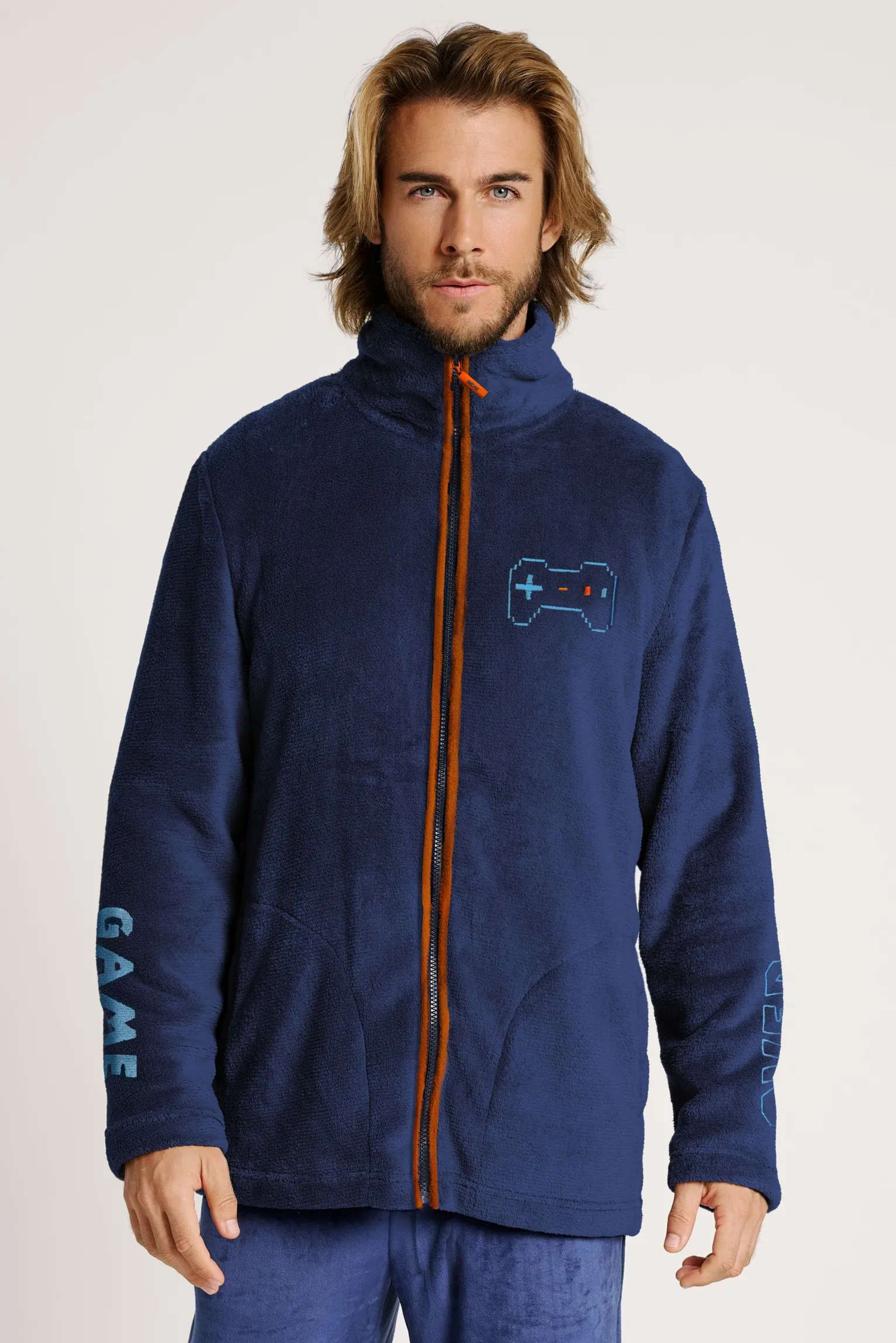 Bata polar de hombre con diseño moderno y detalle temático inspirado en los videojuegos. Fabricada en tejido de tacto suave, proporciona una agradable sensación térmica y está pensada para ofrecer confort durante los días más fríos. Incluye cuello alto, cremallera frontal en contraste color naranja, bolsillos laterales y bordados decorativos gamer: un mando en el pecho y las palabras “GAME OVER” en las mangas.