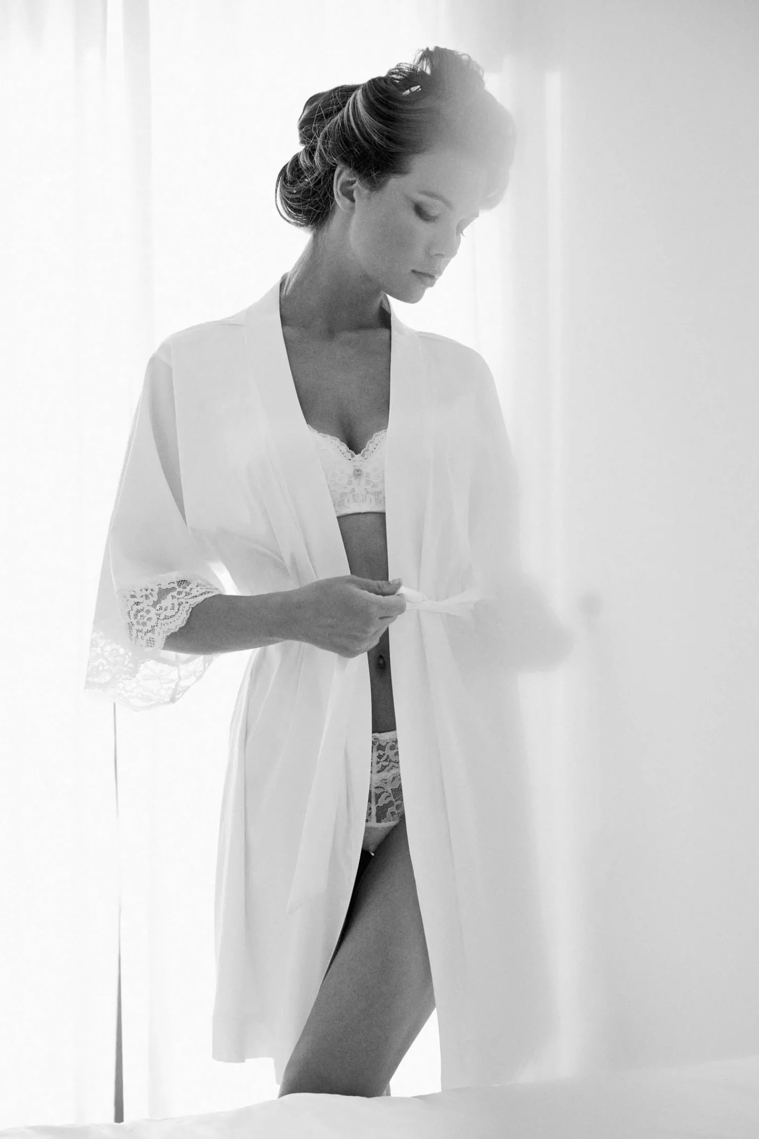 Bata en satén con detalles de encaje, perfecta para novia. Con cinturón y mangas 3/4, es ideal para bodas, ofreciendo elegancia y confort en ese día tan especial.
