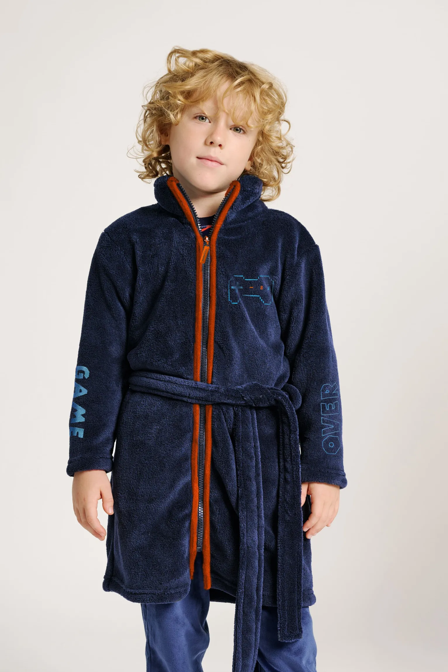 Bata de casa para niño confeccionada en suave tejido polar de color azul marino, decorada con bordados inspirados en el mundo gamer, incluyendo un mando en el pecho y las palabras “GAME” y “OVER” en las mangas. Presenta cremallera frontal en contraste naranja, cinturón ajustable y capucha para mayor abrigo. Un diseño cómodo y original, ideal para mantener el calor en los días fríos con un toque divertido