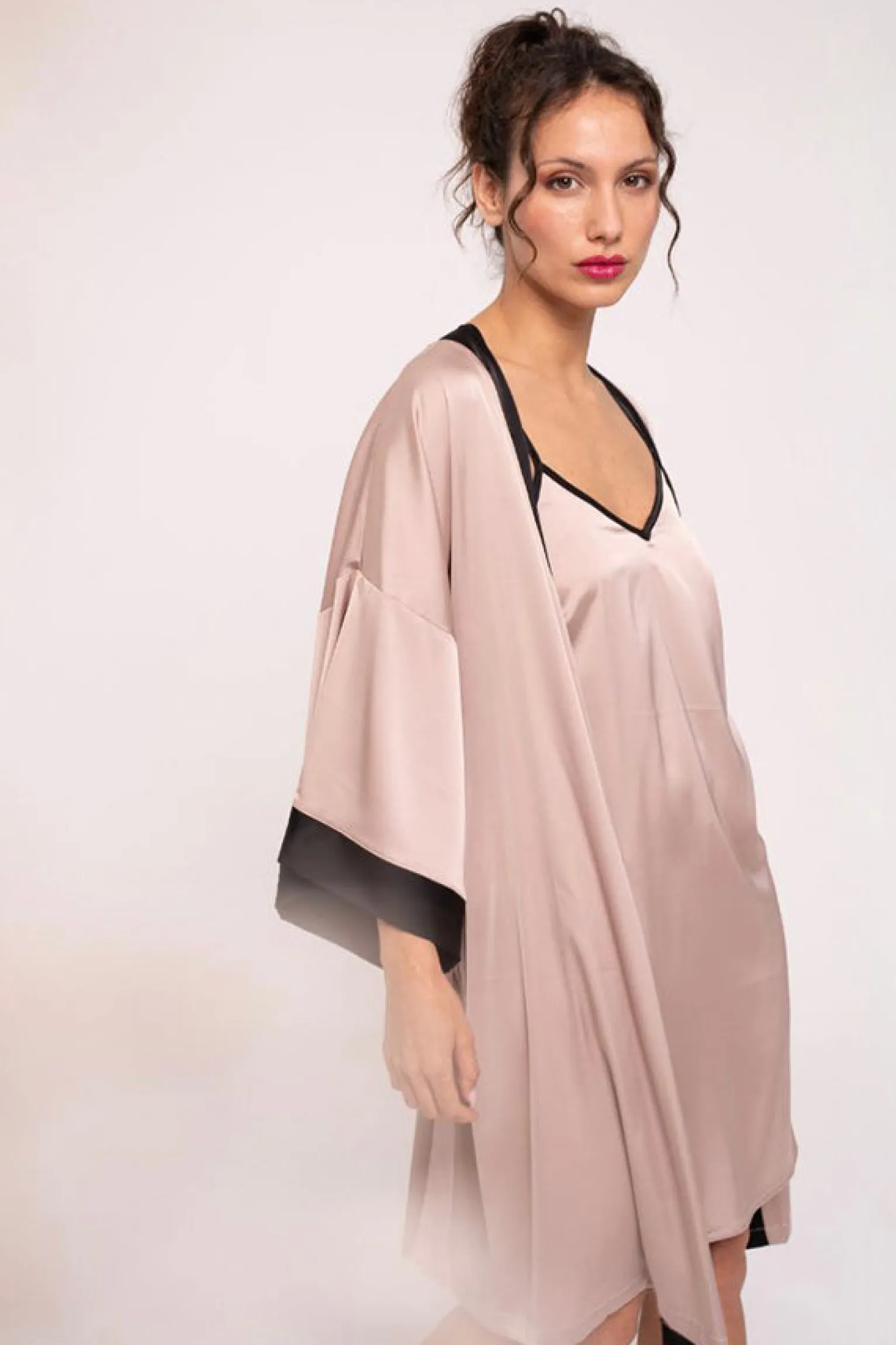 Bata de satén con manga larga. Esta prenda incluye un cinturón para ajustar en la cintura.