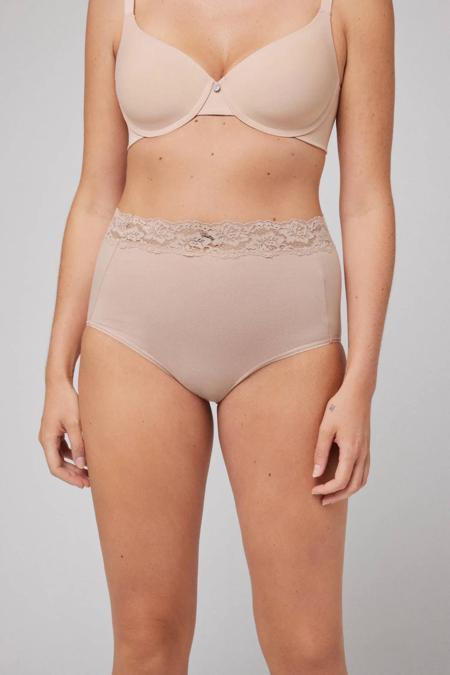 ¡Obtén el ajuste perfecto y el máximo confort con nuestra braga alta básica de algodón natural con ligero efecto control en abdomen y glúteos! Esta braga ofrece soporte adicional donde más lo necesitas, mientras que el encaje en la cintura añade un toque de elegancia. Fabricada con algodón natural para una sensación suave y transpirable, te sentirás cómoda y segura todo el día.