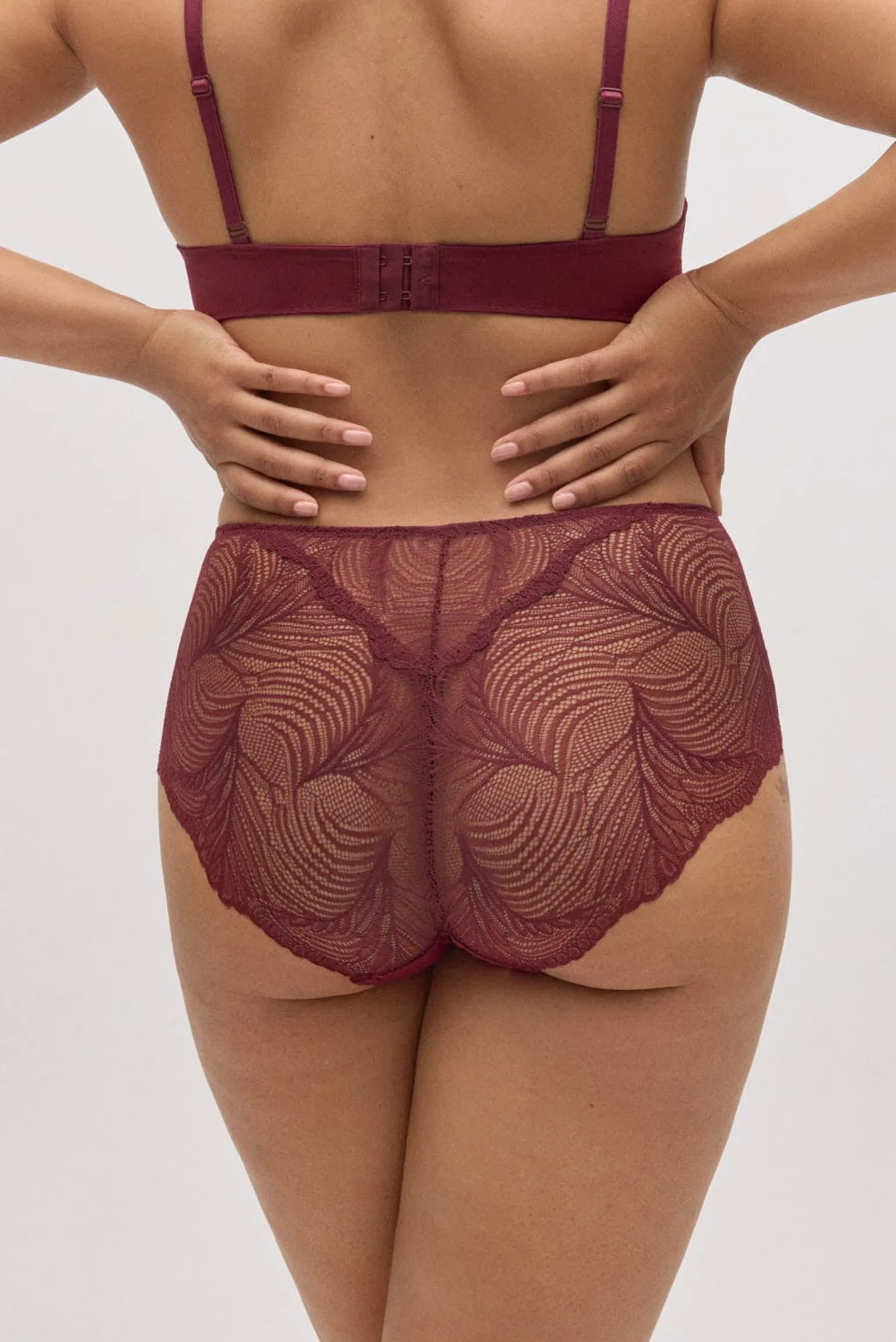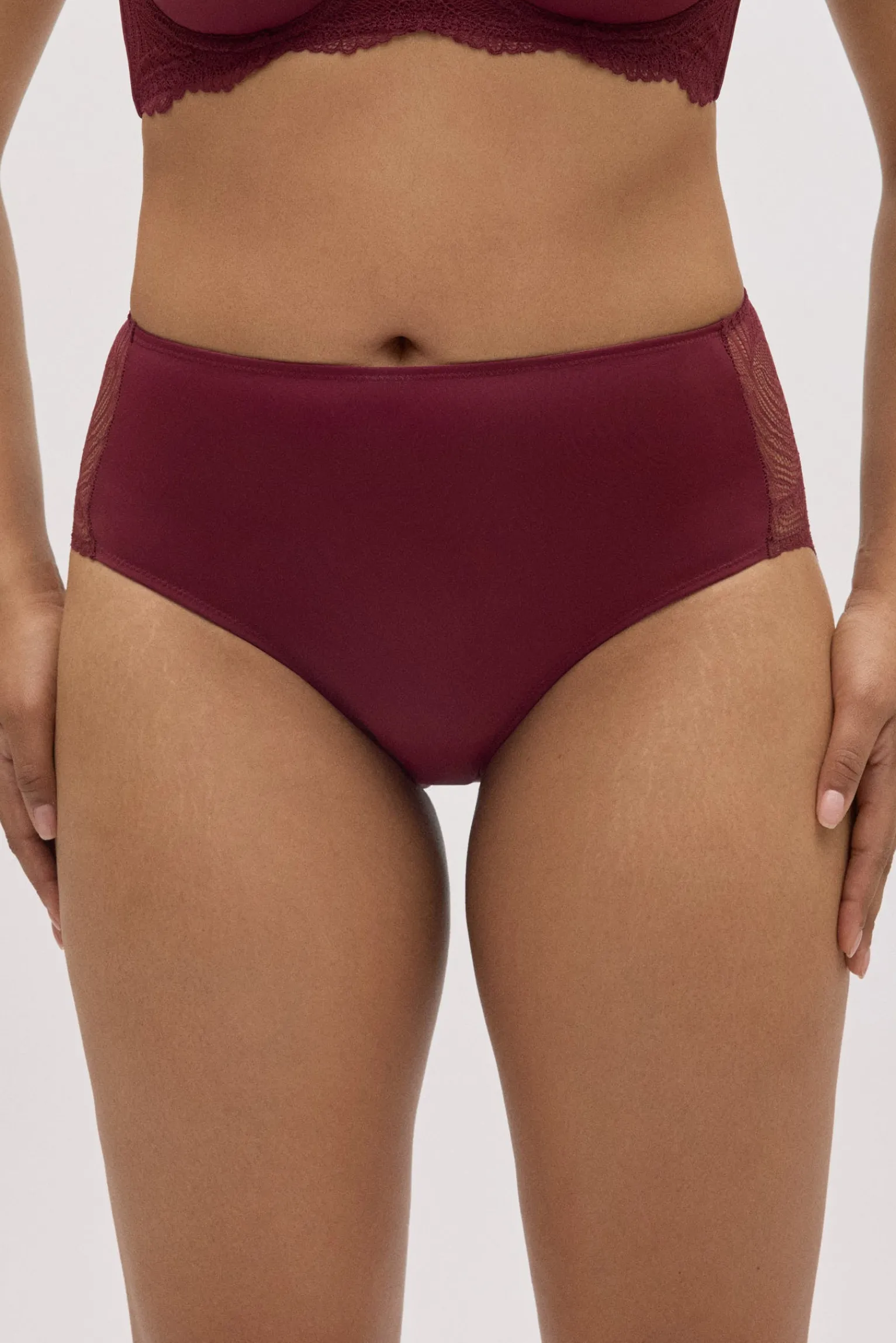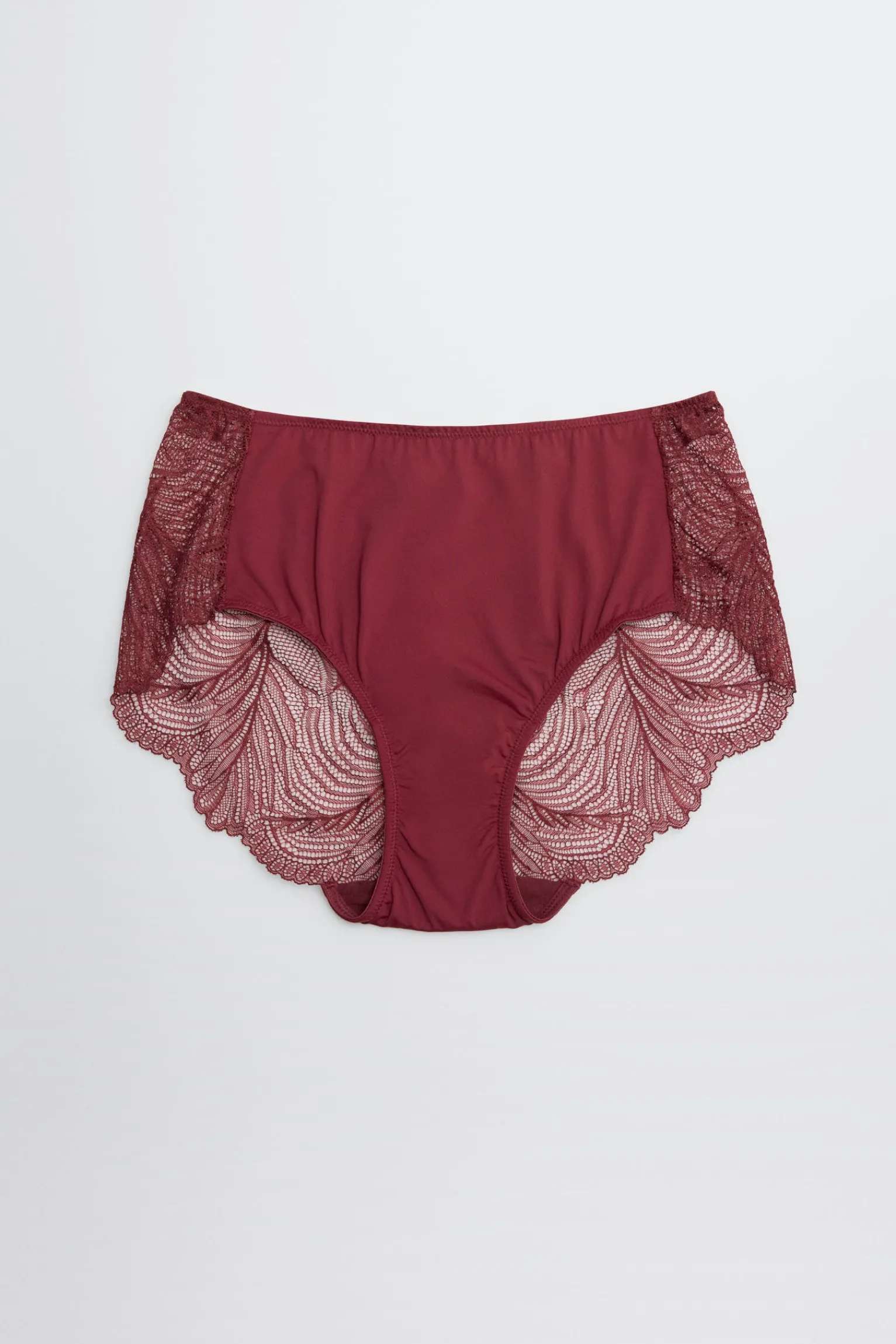 Braga alta de encaje que combina sujeción y sensualidad en una misma prenda. La parte delantera lisa aporta efecto visual más suave en la zona del vientre, mientras que la espalda en encaje semitransparente realza los glúteos con un acabado elegante. El forro interior (crotch) de 100% algodón suma confort y transpirabilidad para el día a día. Combínala con uno de los sujetadores a juego y crea tu propio look de lencería..