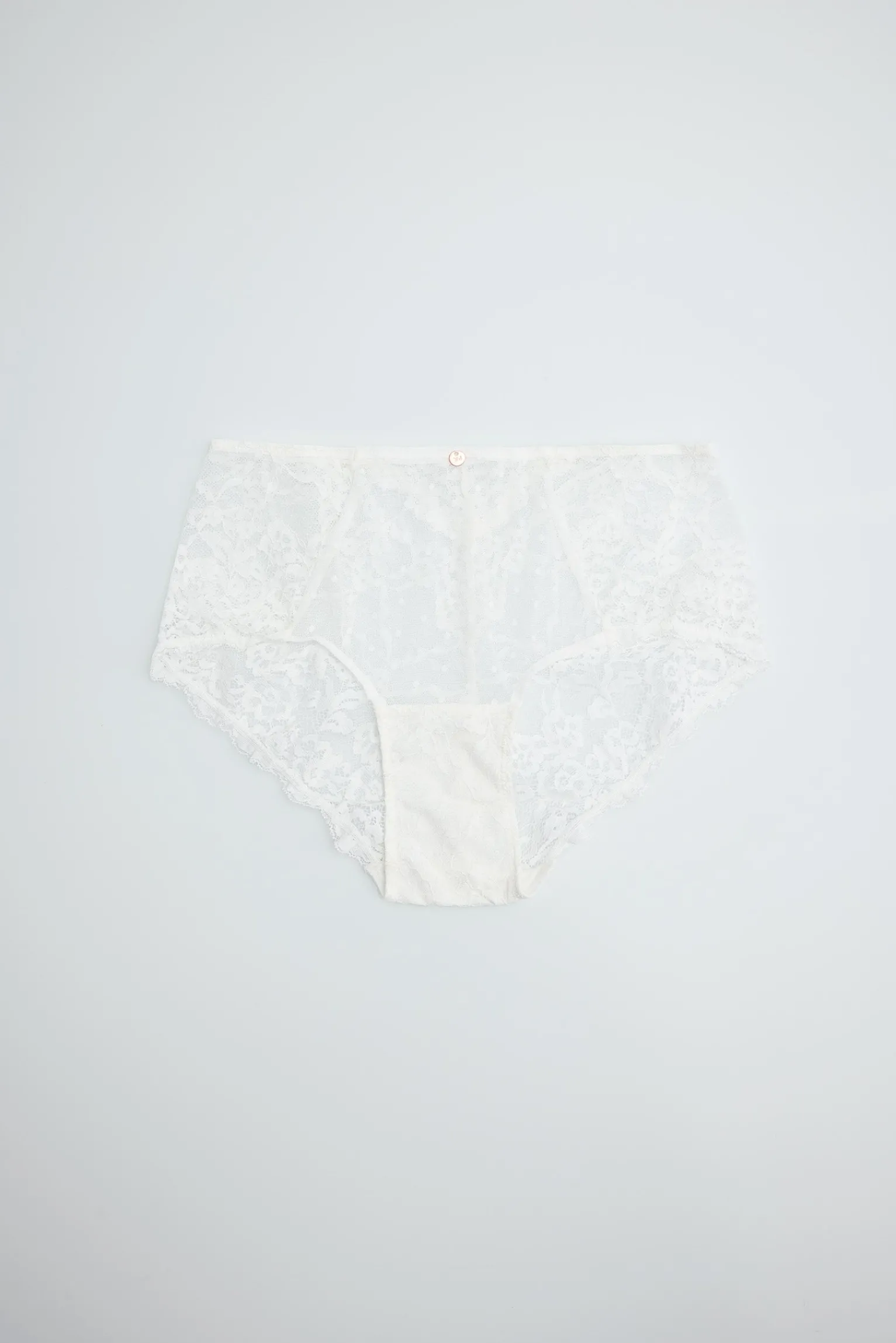 Braga estilo maxi que combina encaje floral y de lunares, aportando elegancia a la prenda. Ideal para ocasiones especiales, es una opción perfecta para la novia en su conjunto nupcial.