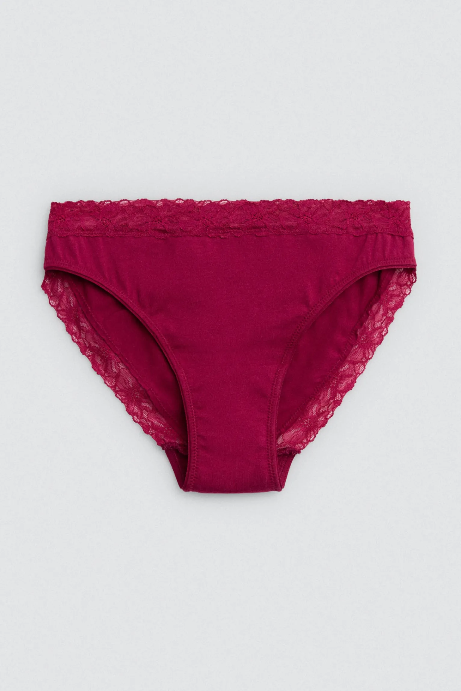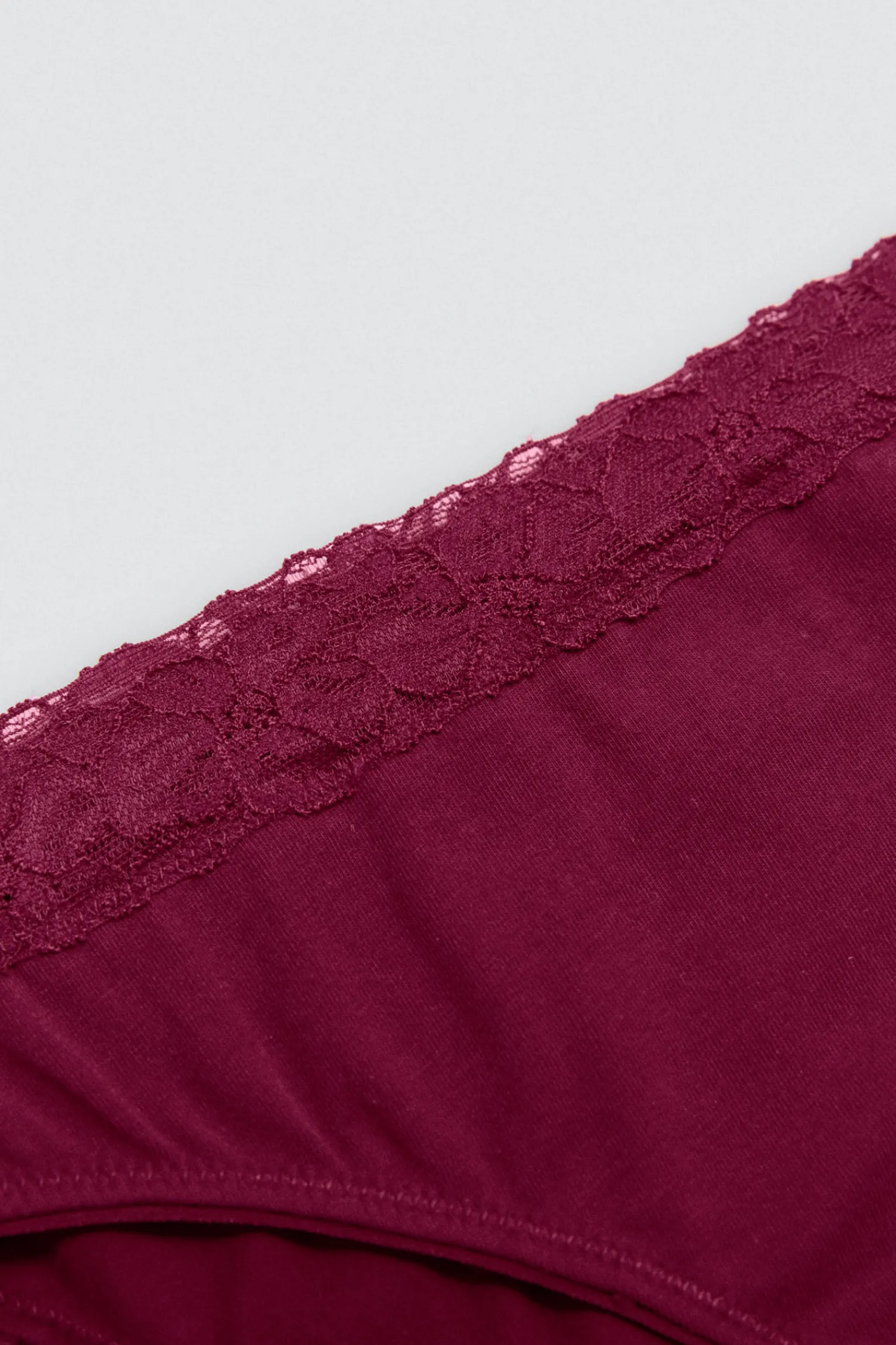 Braga mini confeccionada en algodón natural para ofrecer suavidad, adaptabilidad y transpirabilidad. Su diseño liso se completa con delicados detalles de encaje en la cintura y los contornos, aportando un acabado femenino y elegante ideal para el uso diario.