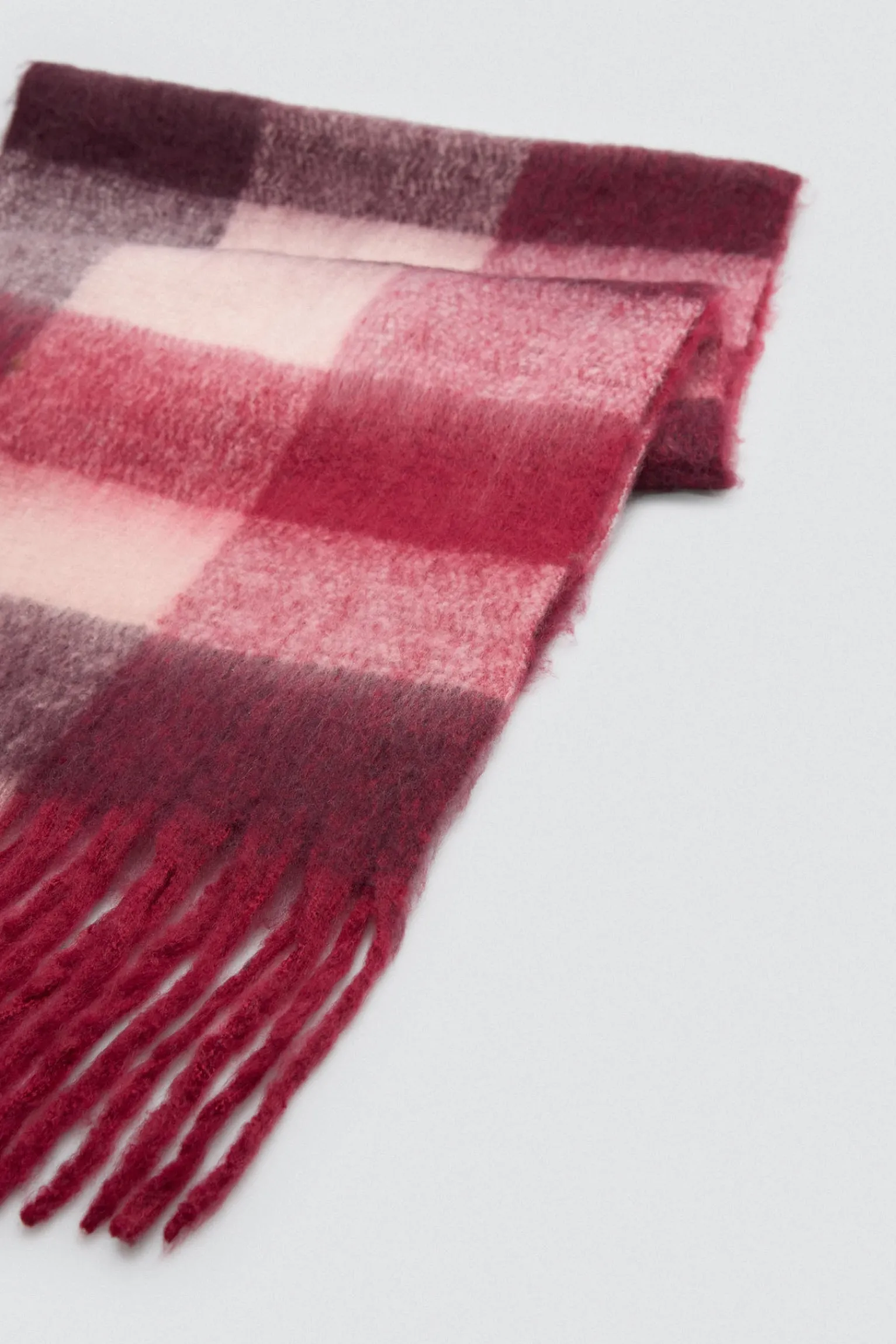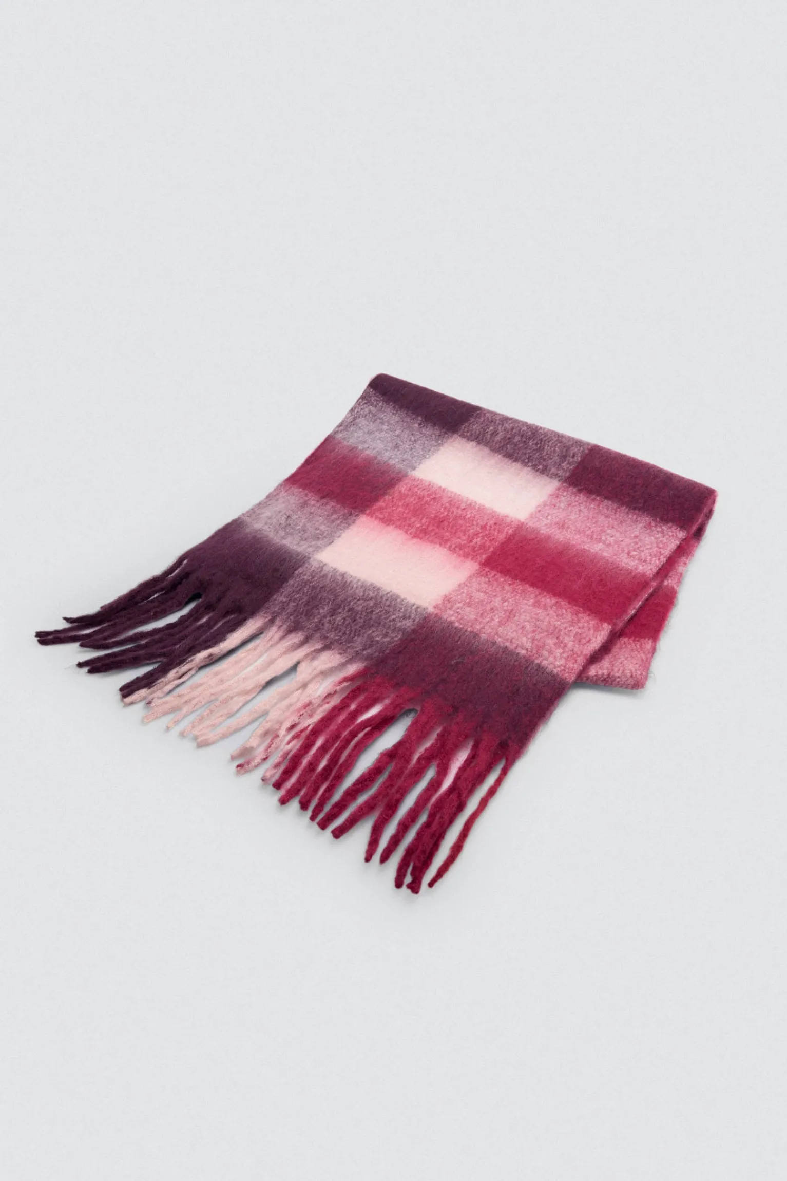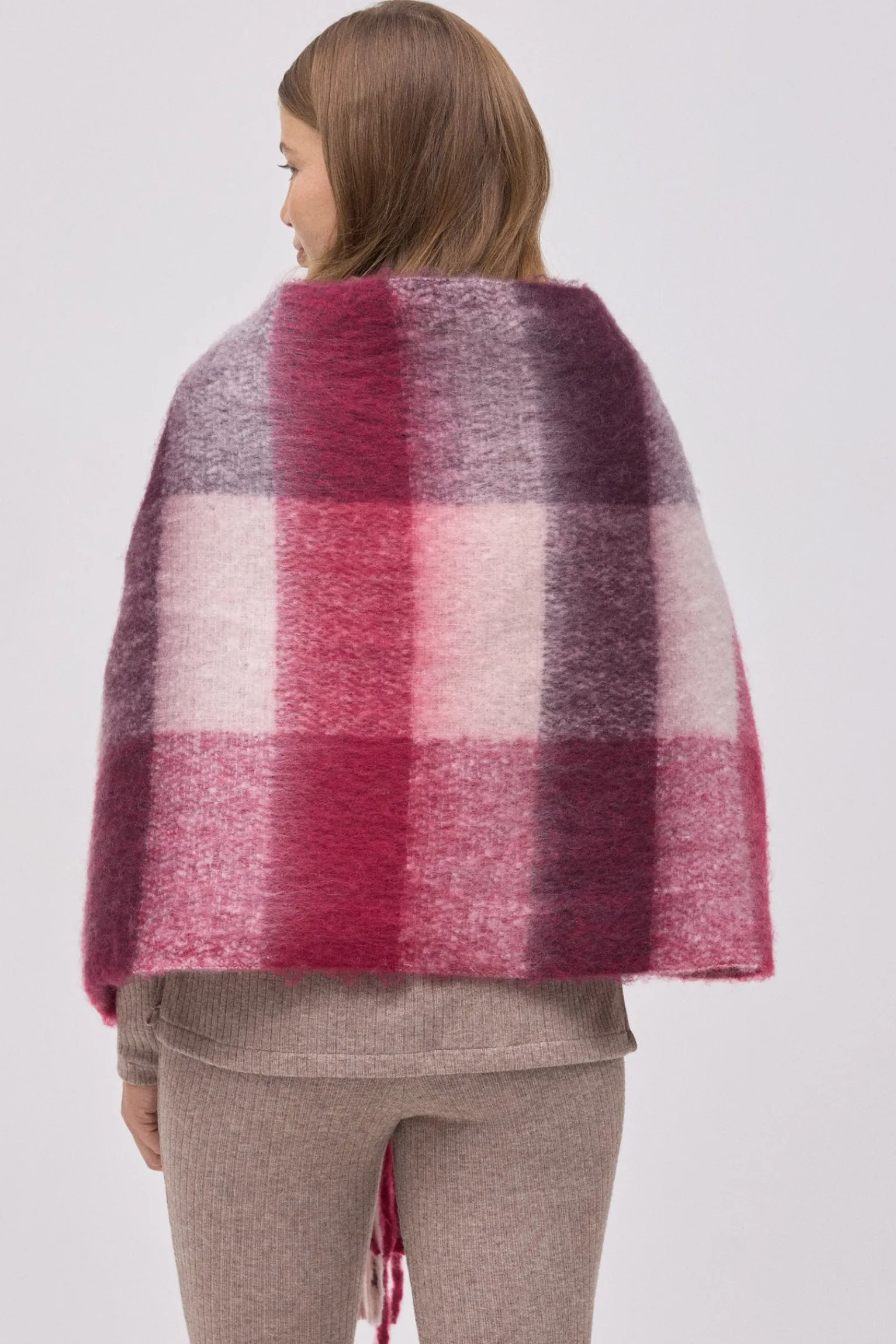 Estilo british renovado. Bufanda tipo pashmina de cuadros grandes en tonos granate, rosa y blanco. Elegante, cálida y con presencia.