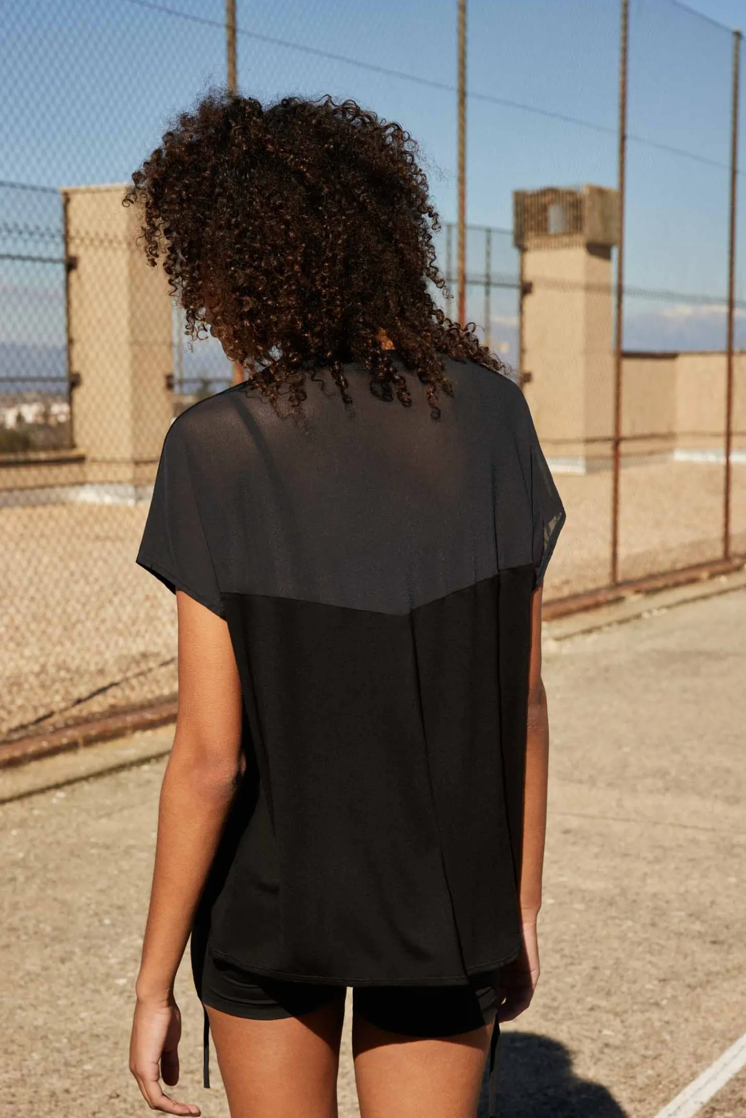 Camiseta deportiva de manga corta con detalles de tul transparente en el cuello y espalda. Ideal para combinar con nuestra colección de leggings y tops deportivos. Color negro.