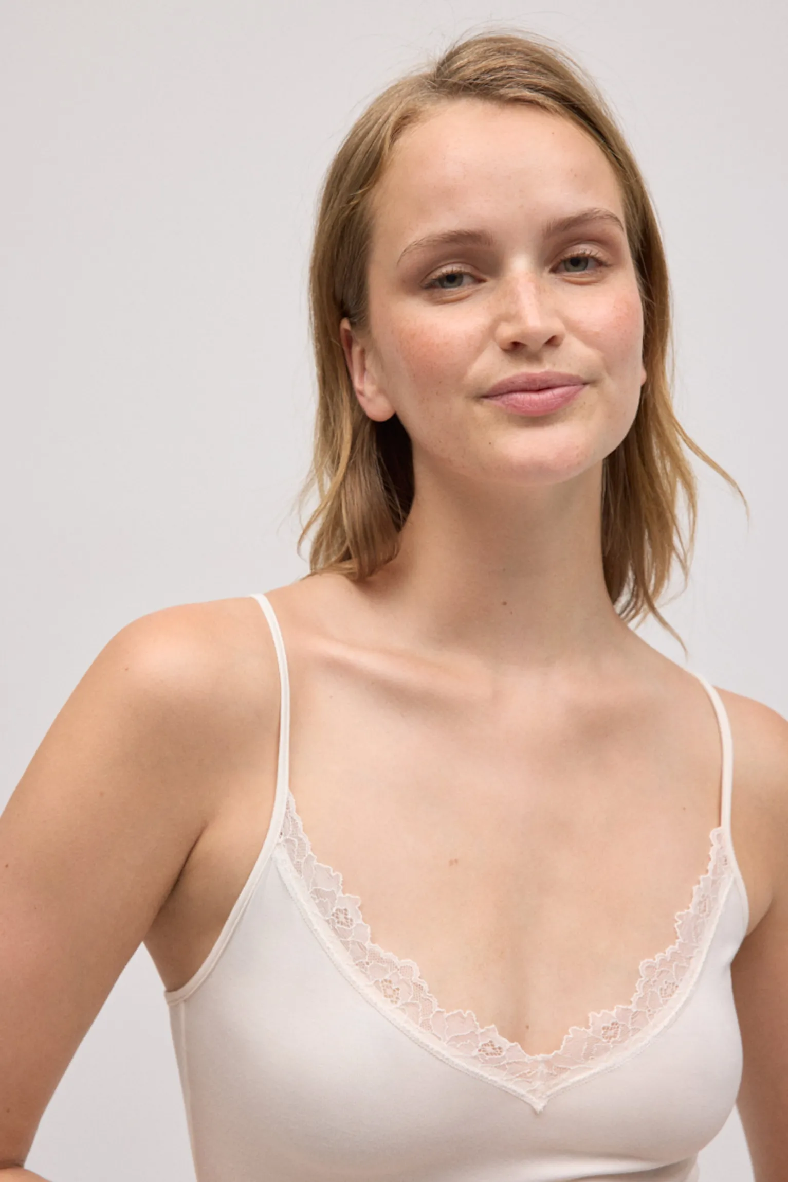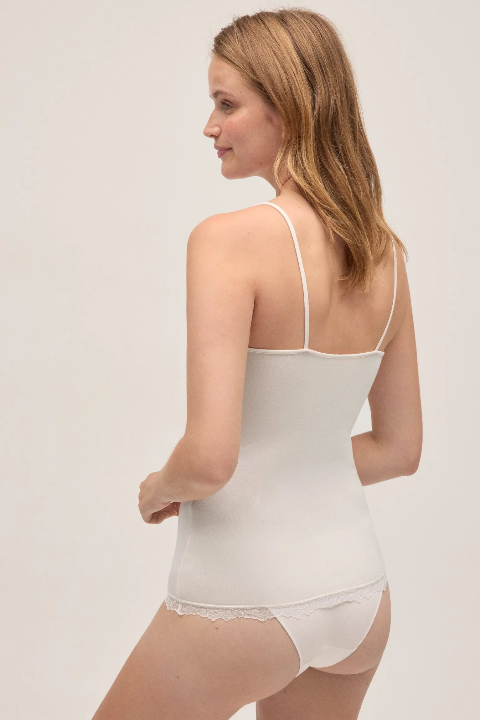 Disfruta de la suavidad y frescura natural del bambú en una prenda pensada para tu día a día. Con tirantes finos y delicado encaje en el escote y el bajo, esta camiseta combina confort, feminidad y ligereza.