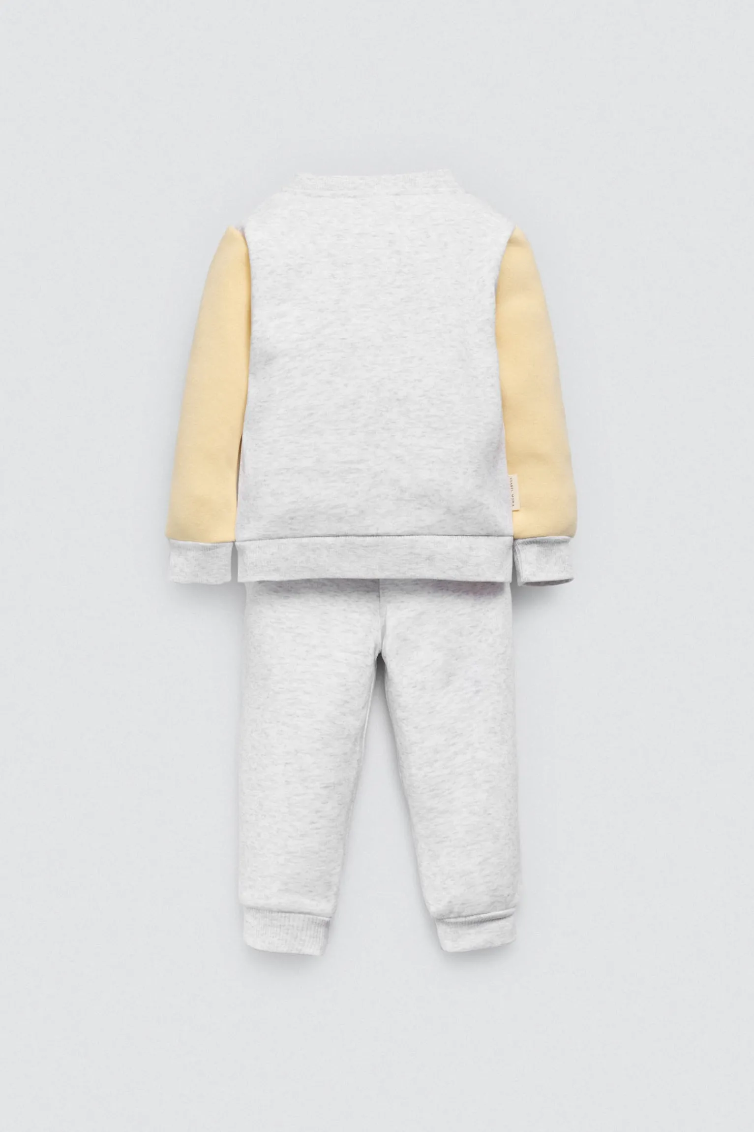 Conjunto de bebé estilo chándal en gris claro con chaqueta de cremallera y pantalón jogger a juego. Tejido afelpado y cómodo, ideal para entretiempo e invierno. Diseño neutro con mensaje Hello World para un look moderno y tierno. Unisex.