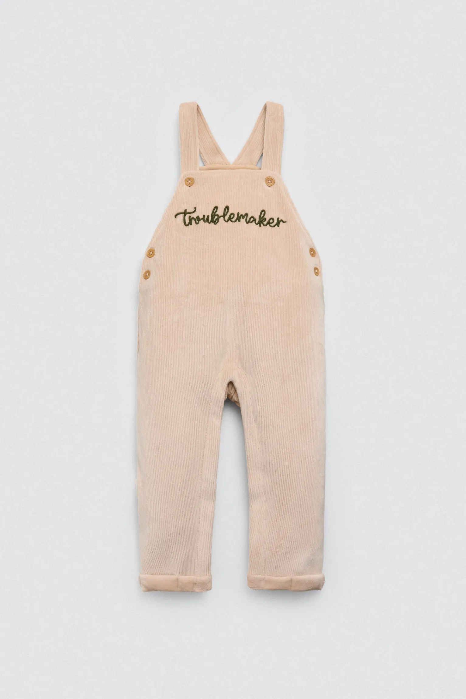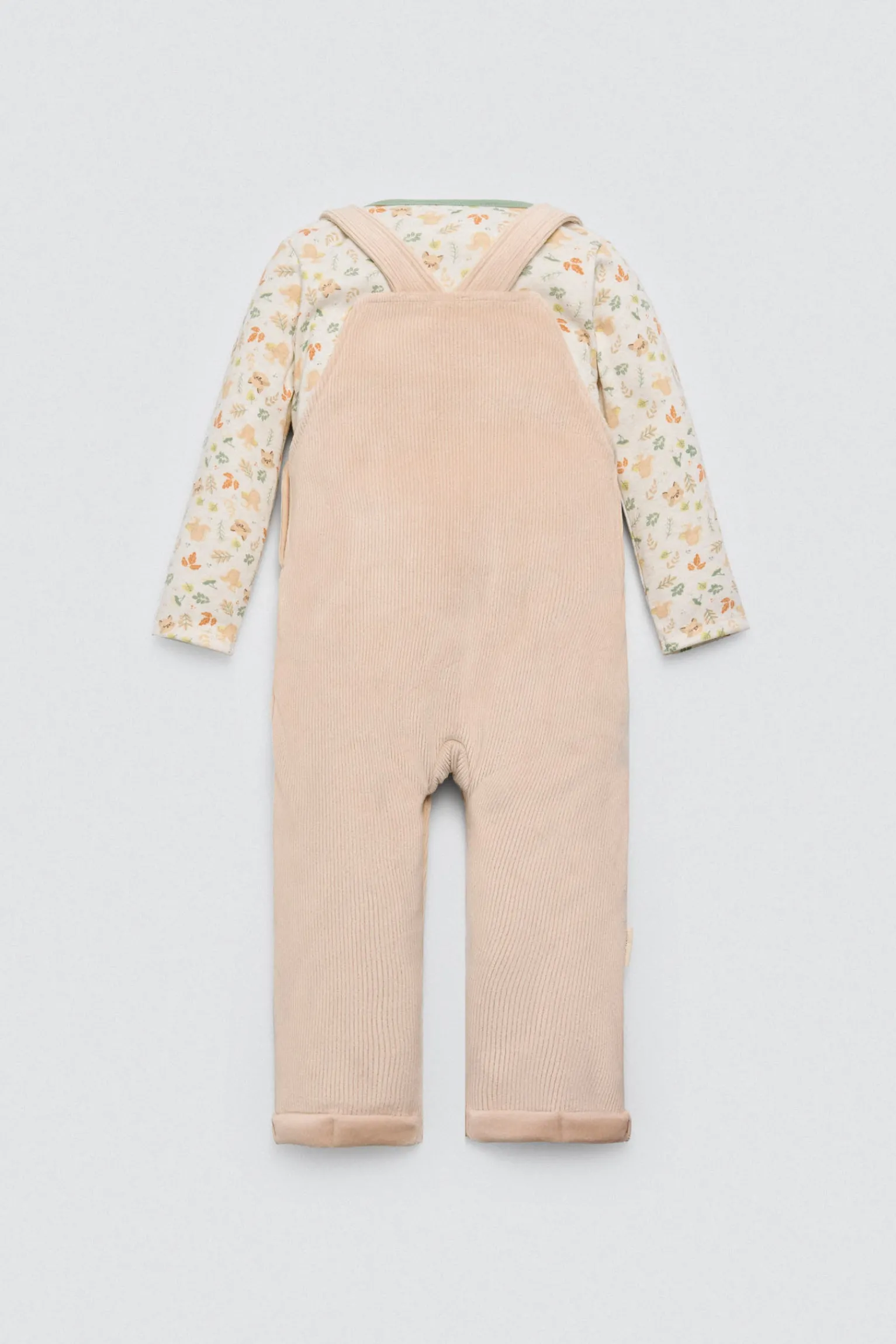 Conjunto de 2 piezas para bebé confeccionado en algodón natural. Incluye camiseta de manga larga con estampado otoñal y peto largo con interior afelpado. Un look cálido y dulce para los días frescos de otoño.