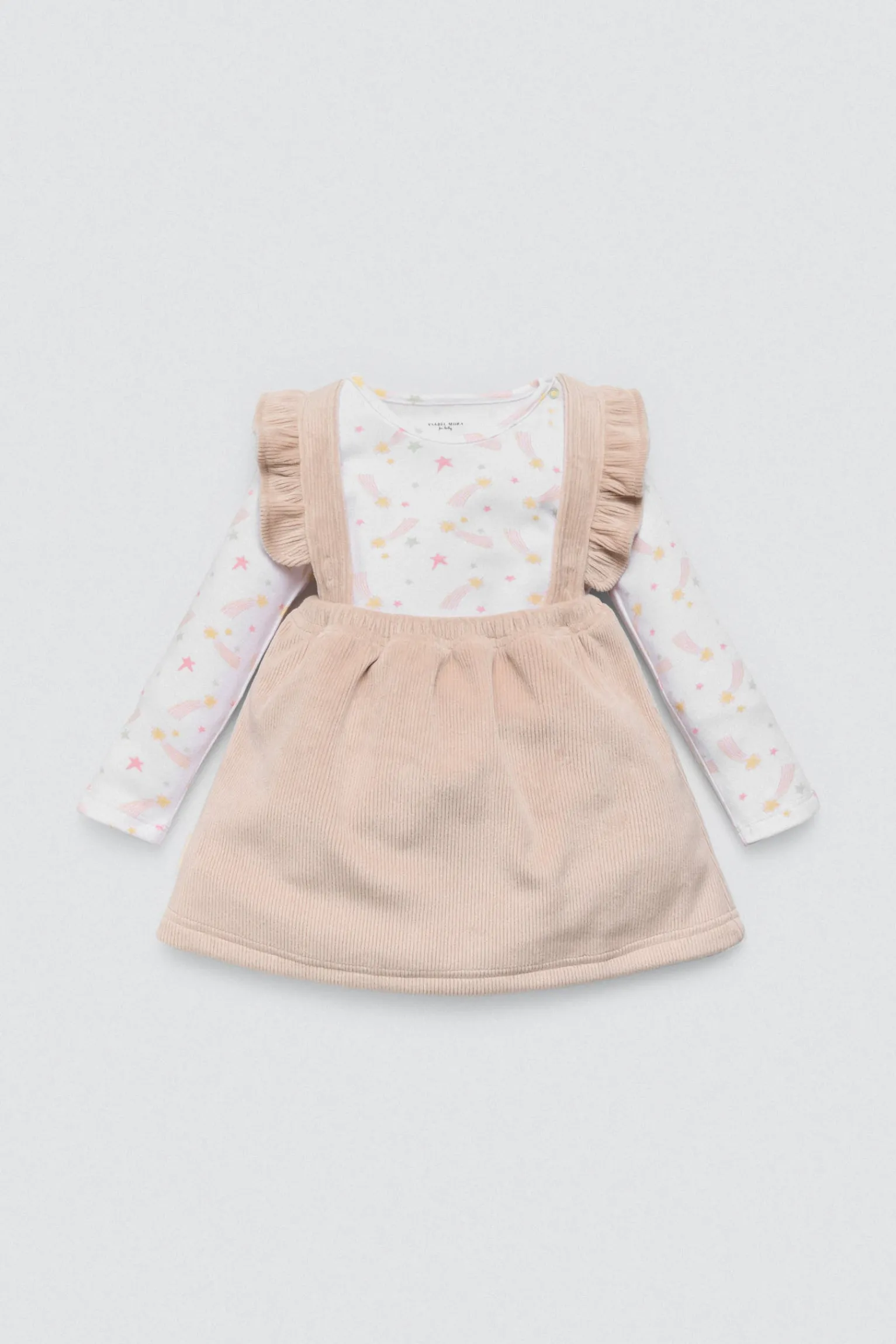 Set de bebé compuesto por camiseta de manga larga estampada y vestido peto con interior afelpado. Inspirado en el universo Fairy Tale, combina dulzura y calidez en un conjunto perfecto para el invierno.