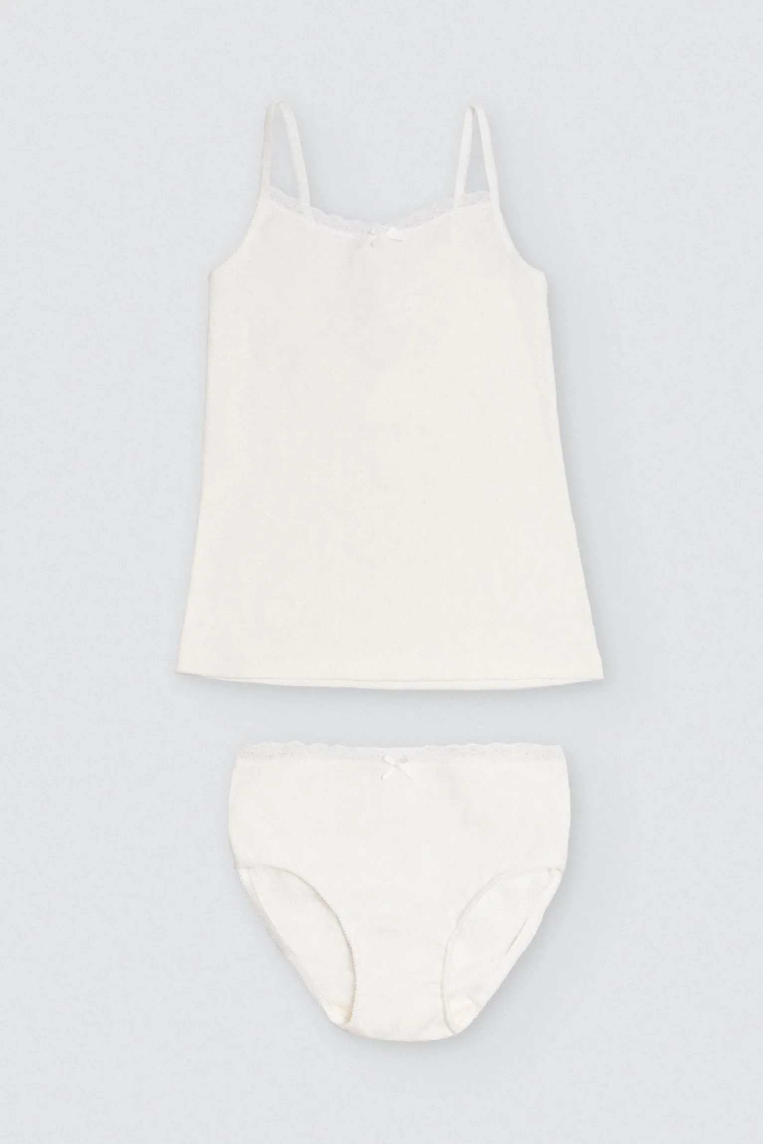 Conjunto infantil de ceremonia compuesto por una camiseta con tirantes finos y una braguita de algodón natural calado .Es un conjunto de vestir para niñas suave, cómodo y elegante. La camiseta tiene una espalda baja y cuenta con un detalle de una blonda de encaje en la parte superior con lazo en el centro. Ideal para eventos. Color marfil o crudo.