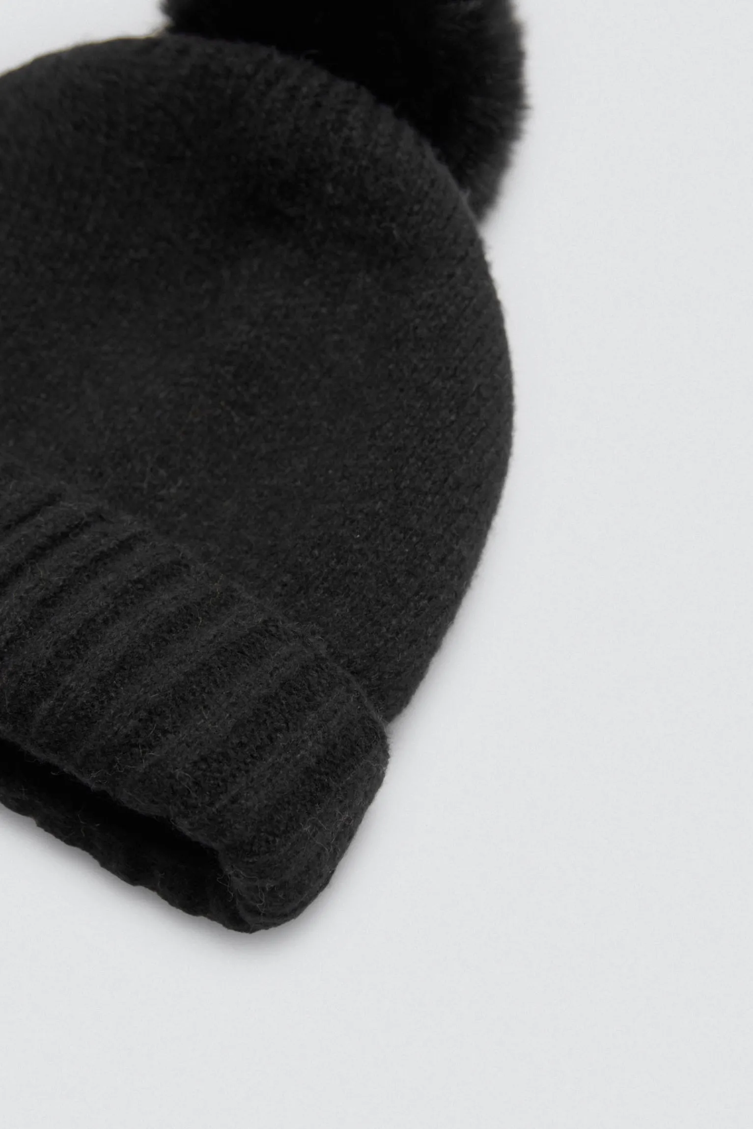Gorro de punto suave con gran pompón en color negro. Ideal para mantenerte abrigada con un look minimalista y actual.