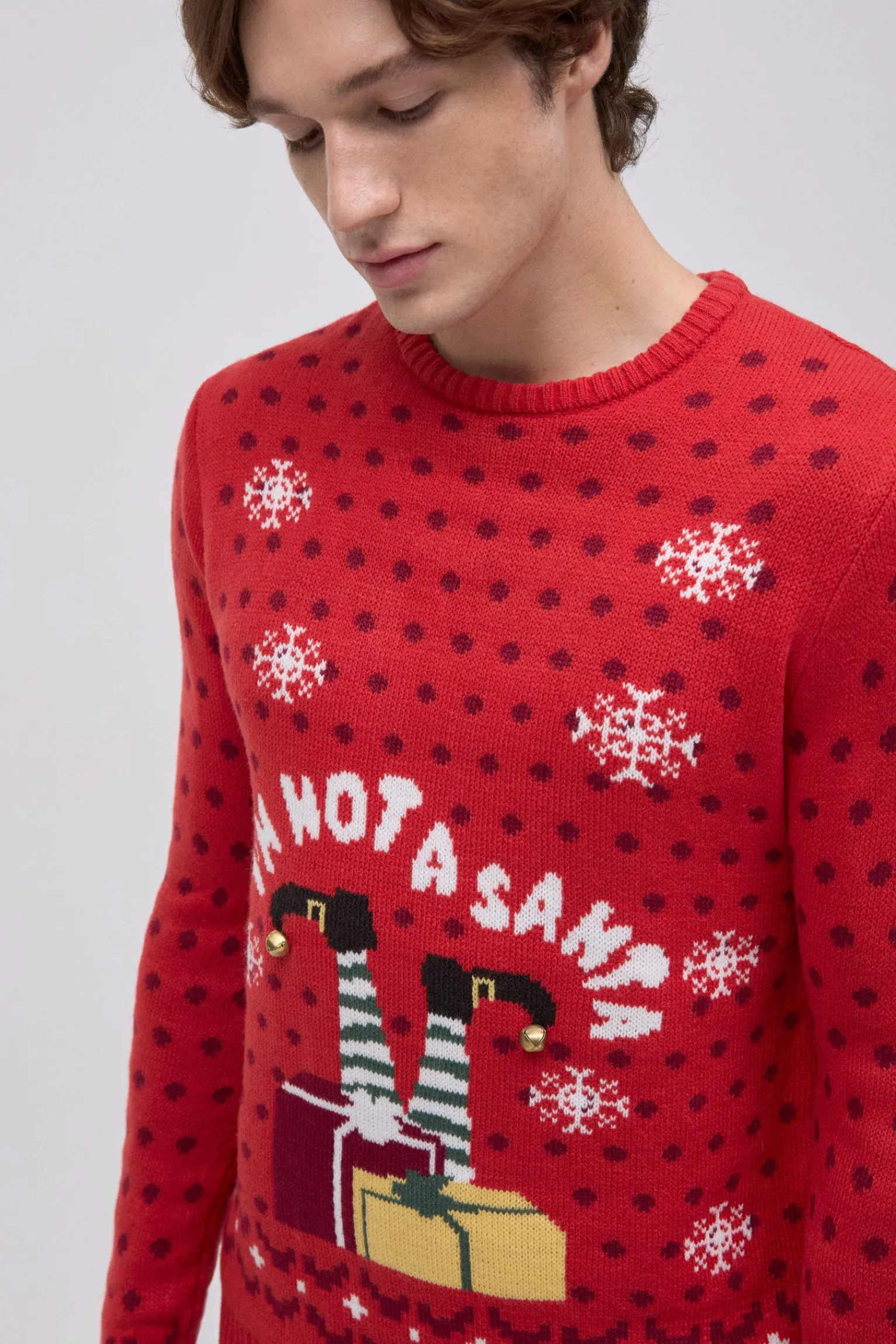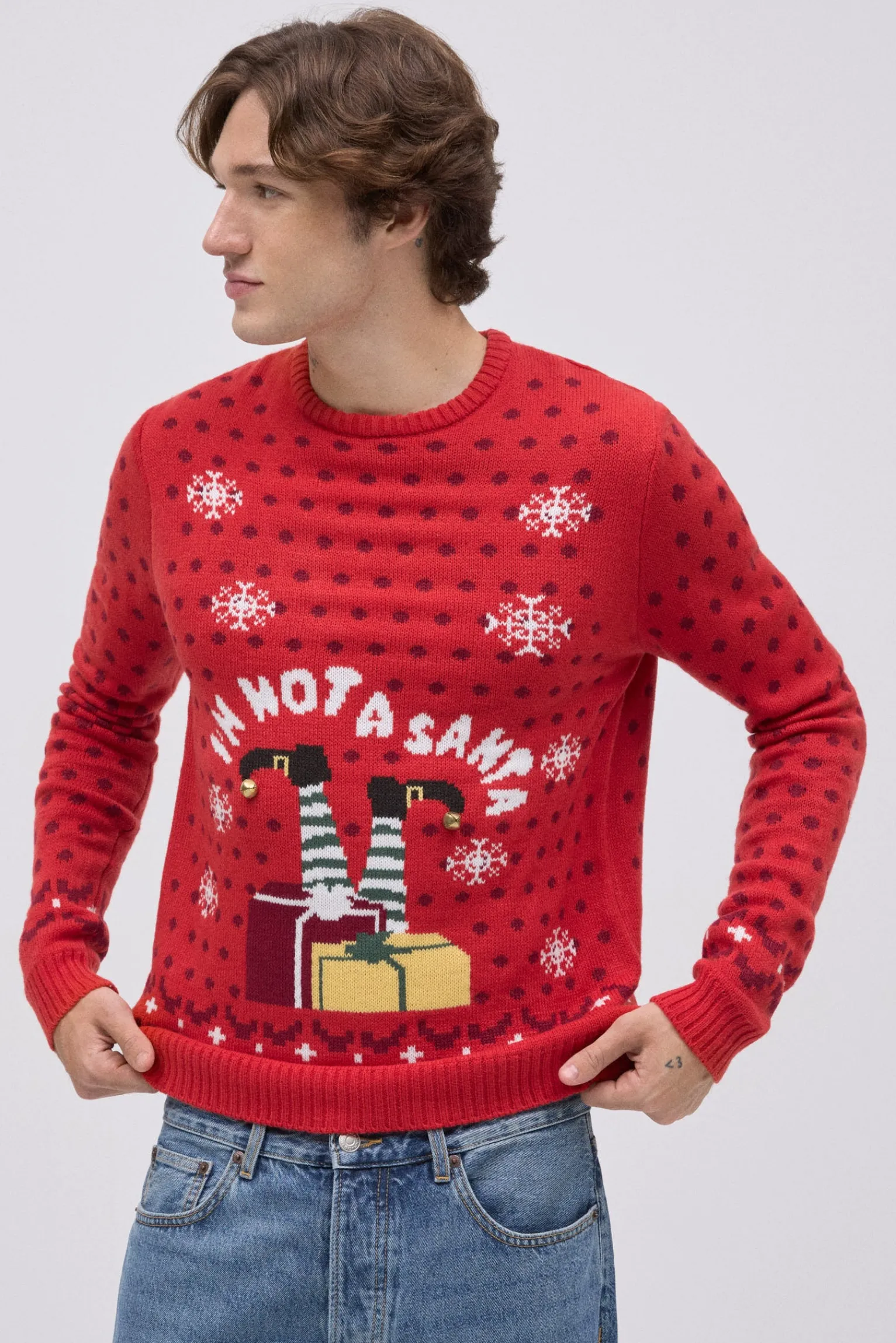 Jersey navideño para hombre. De color rojo vibrante, presenta un estampado de piernas de elfo, regalos y nieve, junto al mensaje “I’m not a Santa”. Como toque final, incorpora cascabeles reales que suenan al moverse.