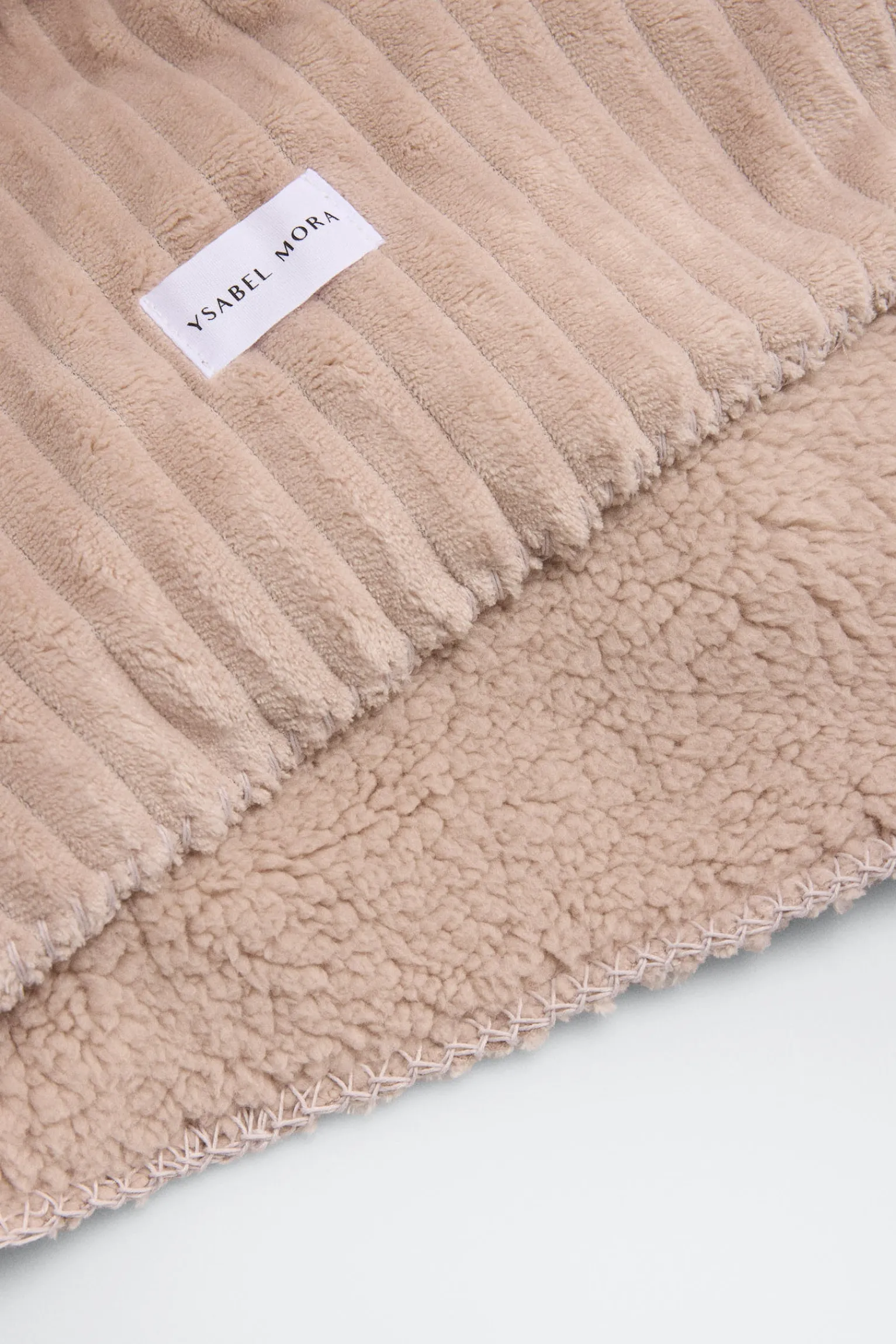Una manta que combina suavidad y calidez: un lado con un efecto canalé de pelo suave y el otro con un cálido borreguito. Perfecta para brindarte el máximo confort durante los días fríos.