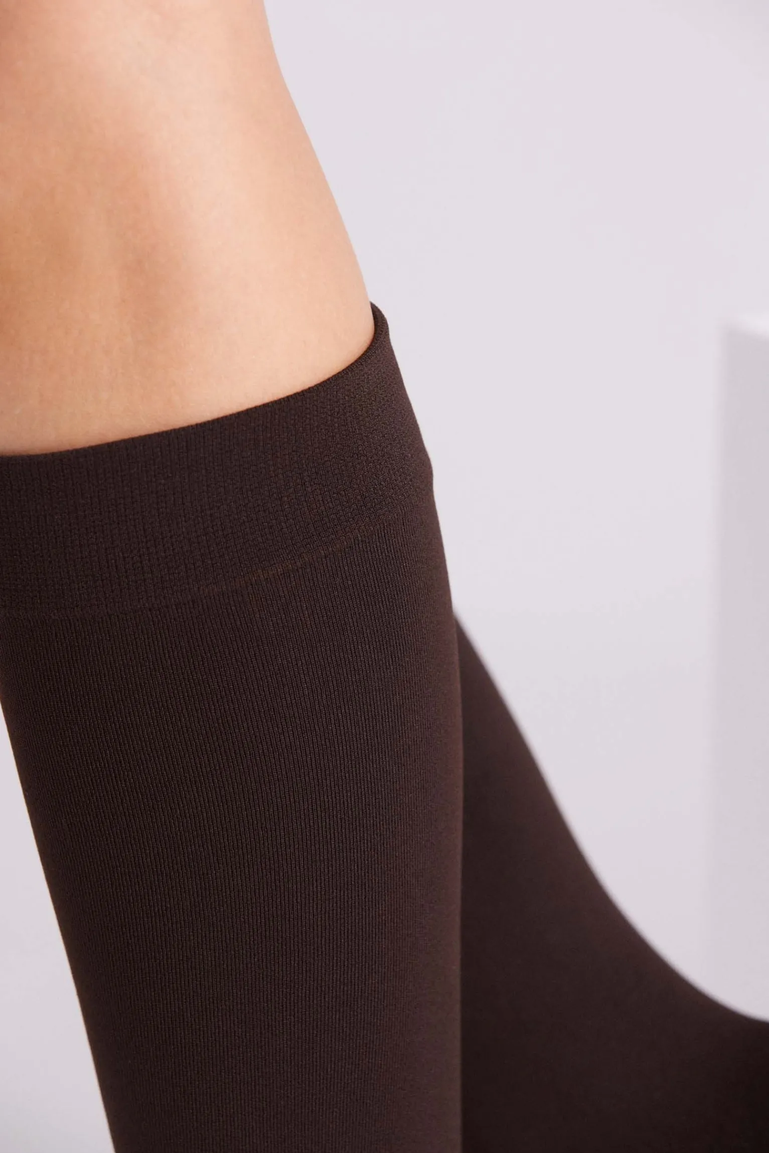 Mini media térmica de 140 Deniers para mujer con interior afelpado. Ideal para los meses más fríos del año. Su puño ancho confort, ofrece el aporte de bienestar y comodidad necesarios en el día a día. Color marrón chocolate.
