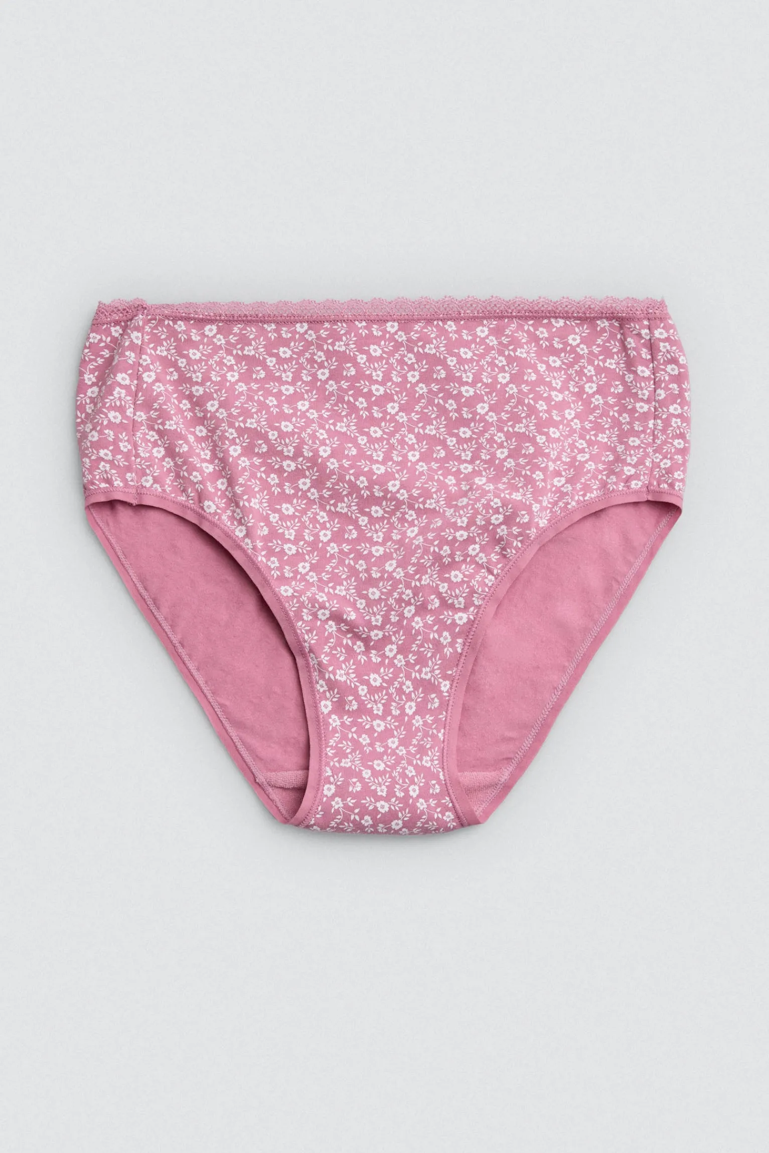 Pack de 2 bragas altas confeccionadas en algodón natural para ofrecer una mayor sensación de confort y sujeción. Presentan estampados femeninos en tonos rosados y un delicado acabado de puntilla en los bordes que aporta un toque romántico. Su diseño de cintura alta envuelve la silueta con suavidad, ideal para el uso diario.
