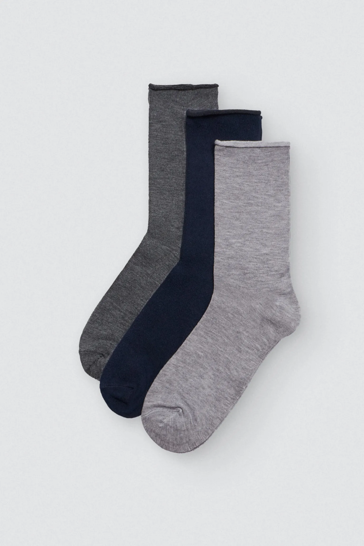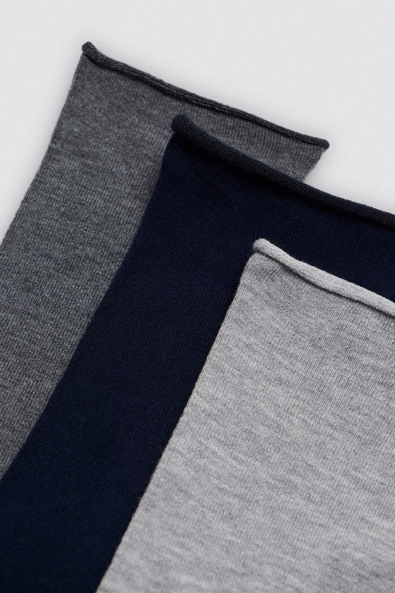 Pack de 3 pares de calcetines para hombre. Sin puño para máxima comodidad. Confeccionados con tejido de bambú, una fibra natural transpirable, antiolores, muy suave y cómoda. Incluye un par de cada color: gris, negro y gris marengo.