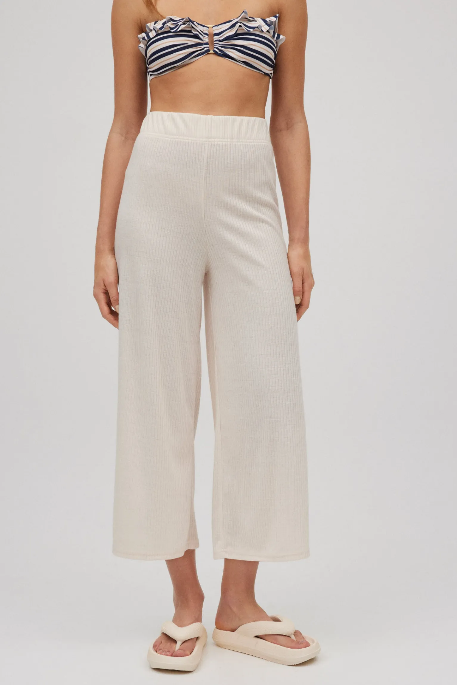Pantalones largos de tejido canalé. Corte ancho y cintura fruncida ajustada al cuerpo. Combínalos con la camisa a conjunto de la colección y completa tu look.