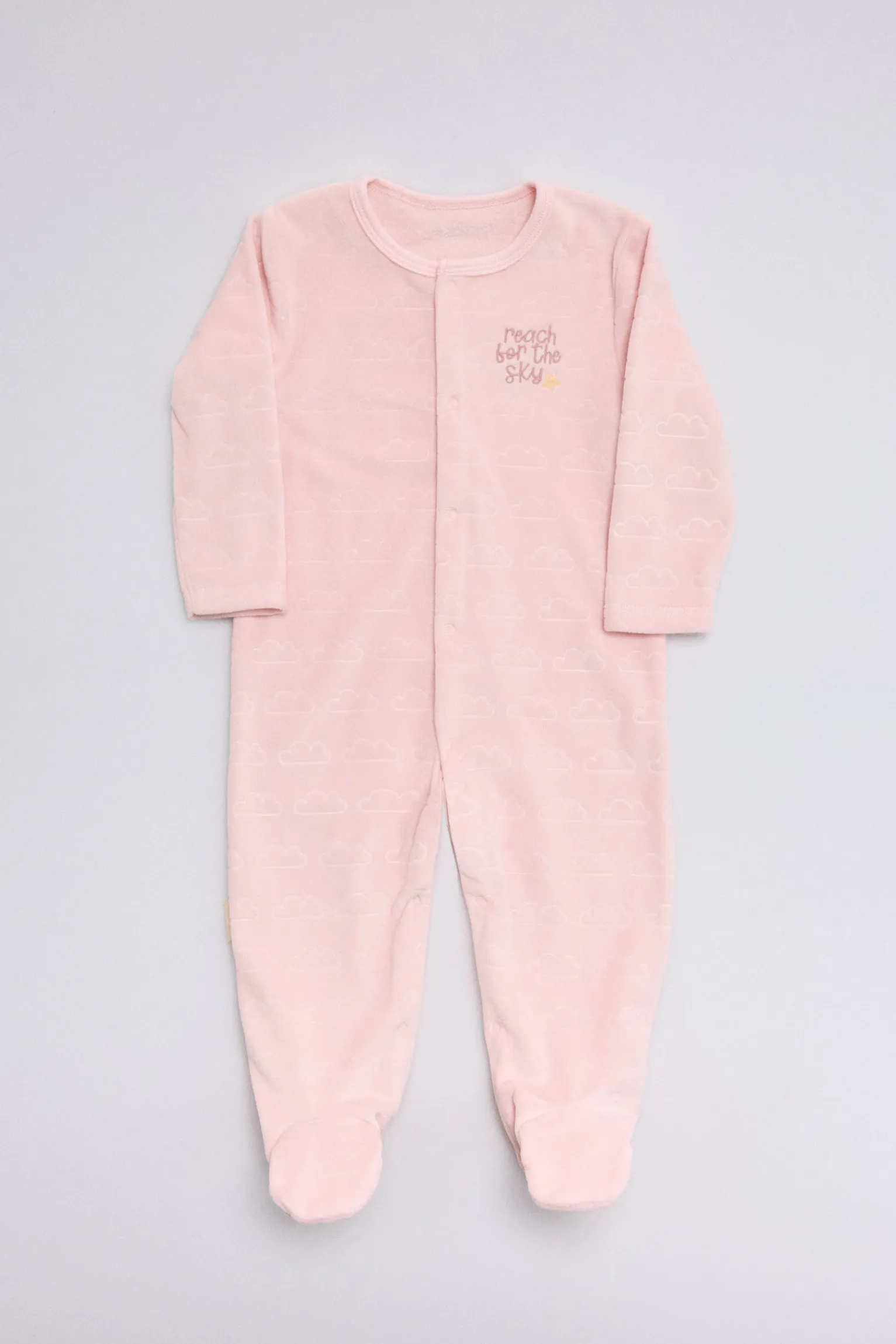 Pelele para bebé con manga larga y tejido afelpado suave. Incluye pies cerrados, Ideal para dormir o estar en casa. Diseño en tono rosa con detalle de estrellas.