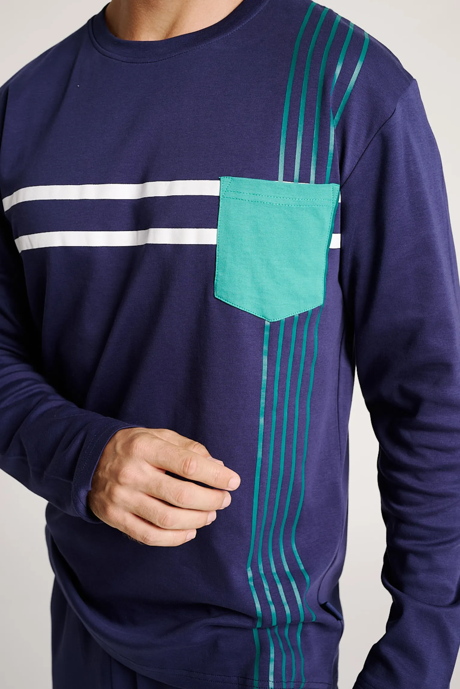 Este pijama largo de hombre combina practicidad y diseño moderno. La camiseta en azul marino destaca con detalles gráficos y un bolsillo en contraste, mientras que el pantalón ofrece el máximo confort para descansar o desconectar en casa.