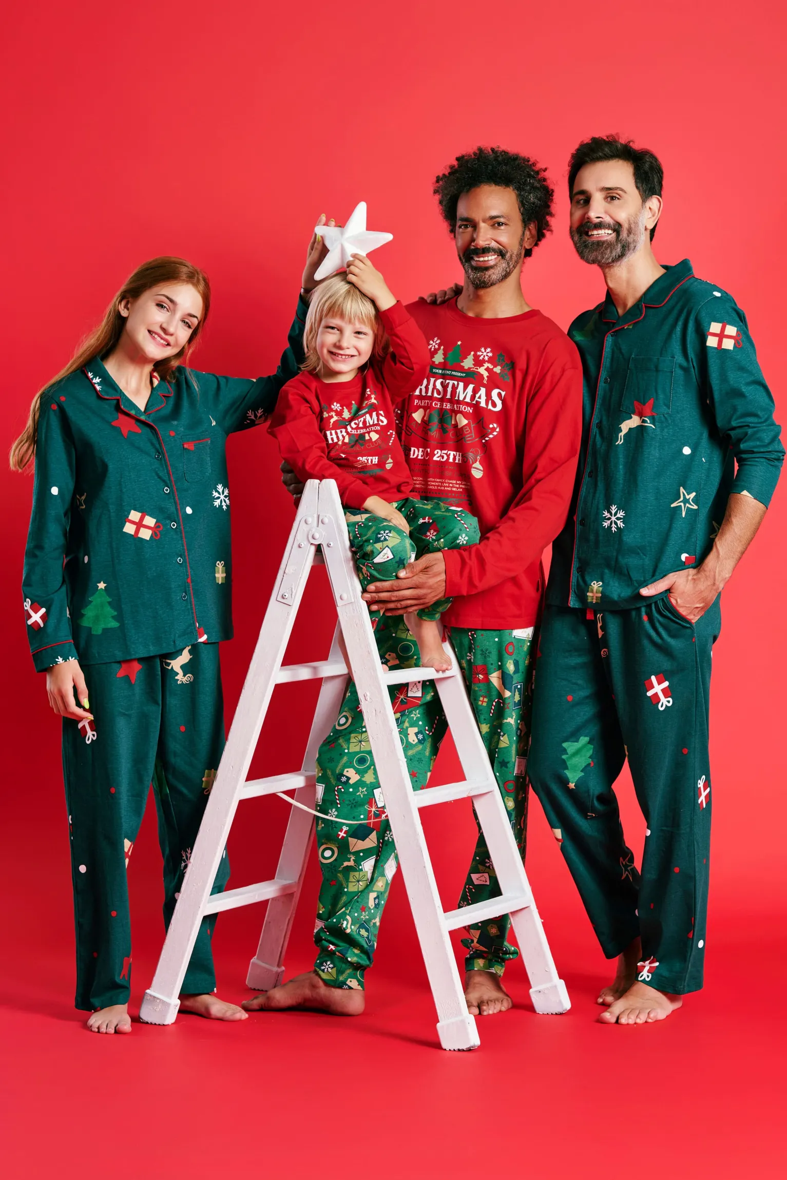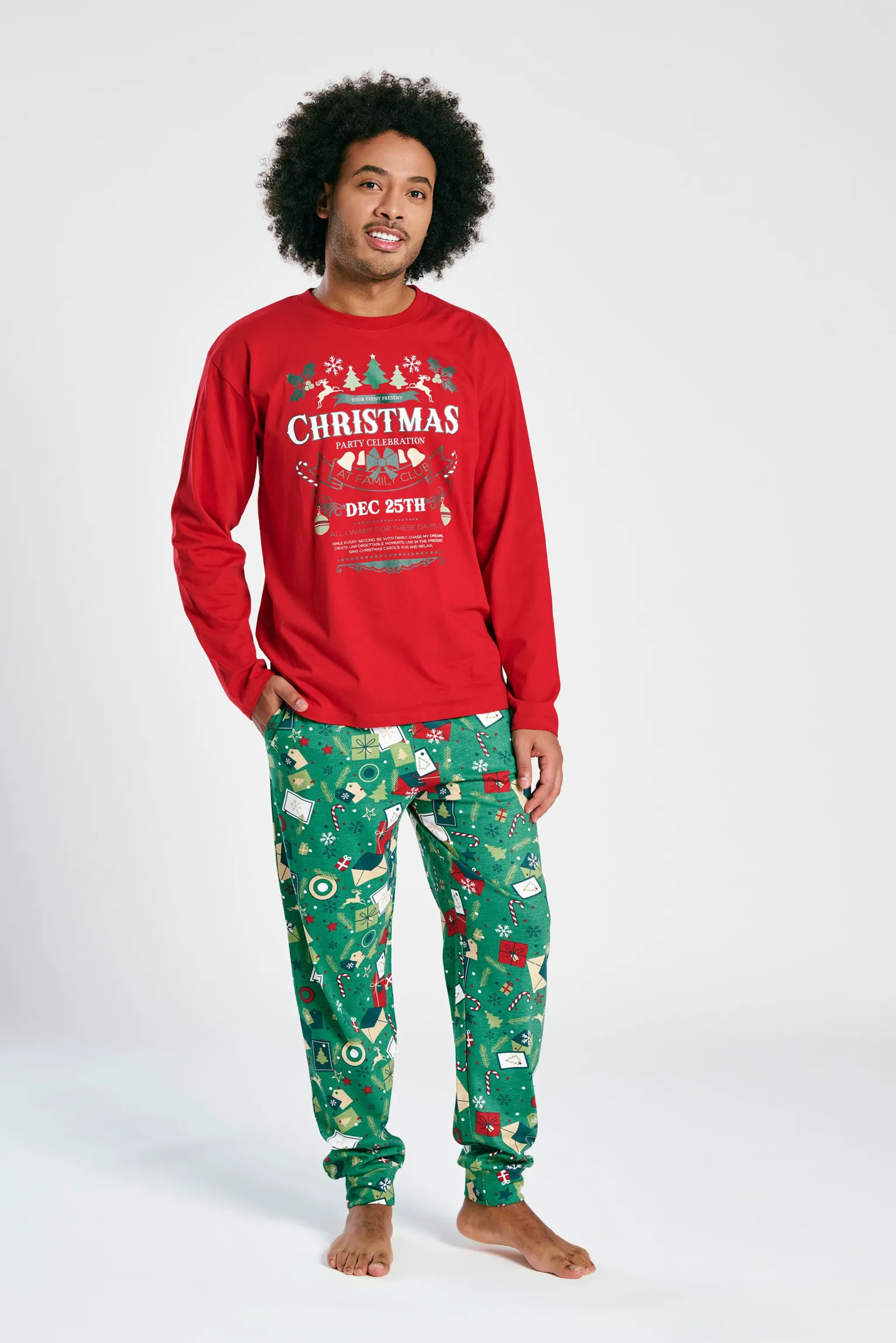 Sumérgete de lleno en el espíritu de la Navidad con este pijama tan festivo como divertido. La camiseta roja de manga larga incluye un diseño central con el texto “Christmas Party Club – Dec 25th”, decorado con copos de nieve, árboles y bastones de caramelo. El pantalón, en un vibrante verde, está repleto de elementos navideños como regalos, adornos, renos y dulces. Ideal para celebrar las fiestas con humor y comodidad, ya sea en casa o para un plan familiar lleno de alegría.