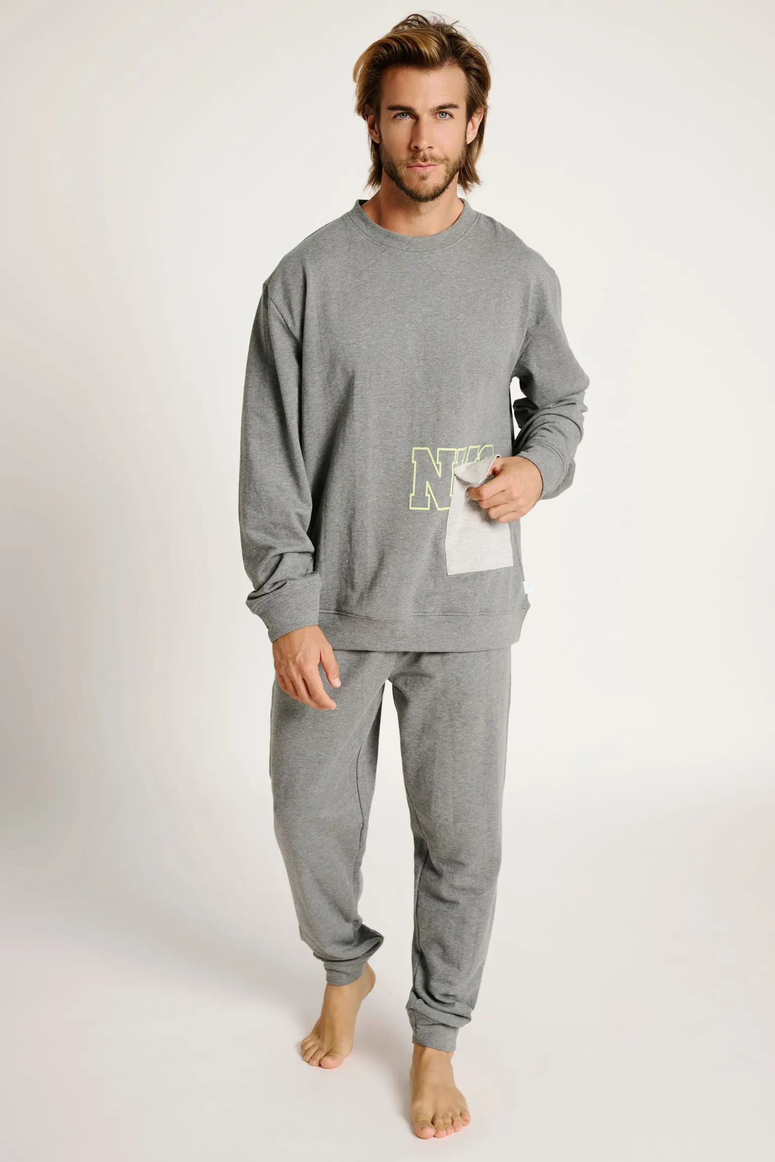 Pijama largo de hombre con un diseño urbano y funcional. La parte superior, estilo sudadera, luce un estampado “NYC” en contraste con detalle flocado y un práctico bolsillo tipo parche. El pantalón a juego, confeccionado en felpa perchada de tacto cálido y suave, incluye bolsillos laterales y cordón ajustable en la cintura. Una opción moderna y cómoda para el descanso diario.