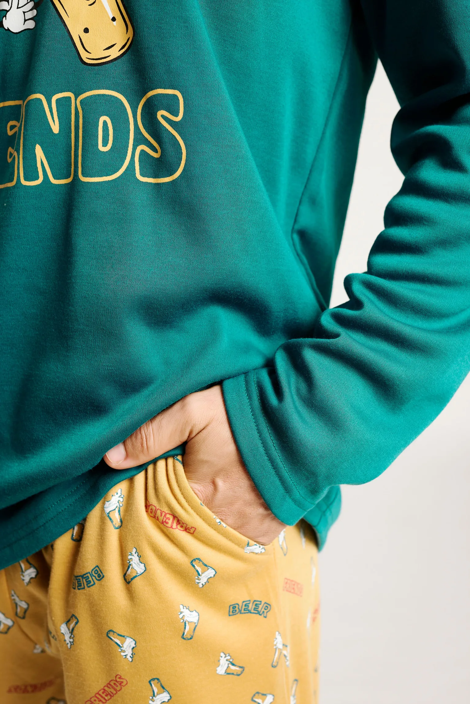 Este pijama largo para hombre combina diversión y confort. La camiseta verde presenta un estampado central con dos botellas brindando y el mensaje “Let’s beer friends”. El pantalón mostaza, con simpáticos dibujos de cerveza, incorpora un práctico bolsillo y cordón ajustable en la cintura para un ajuste cómodo y funcional. Ideal para relajarse en casa con estilo y comodidad.
