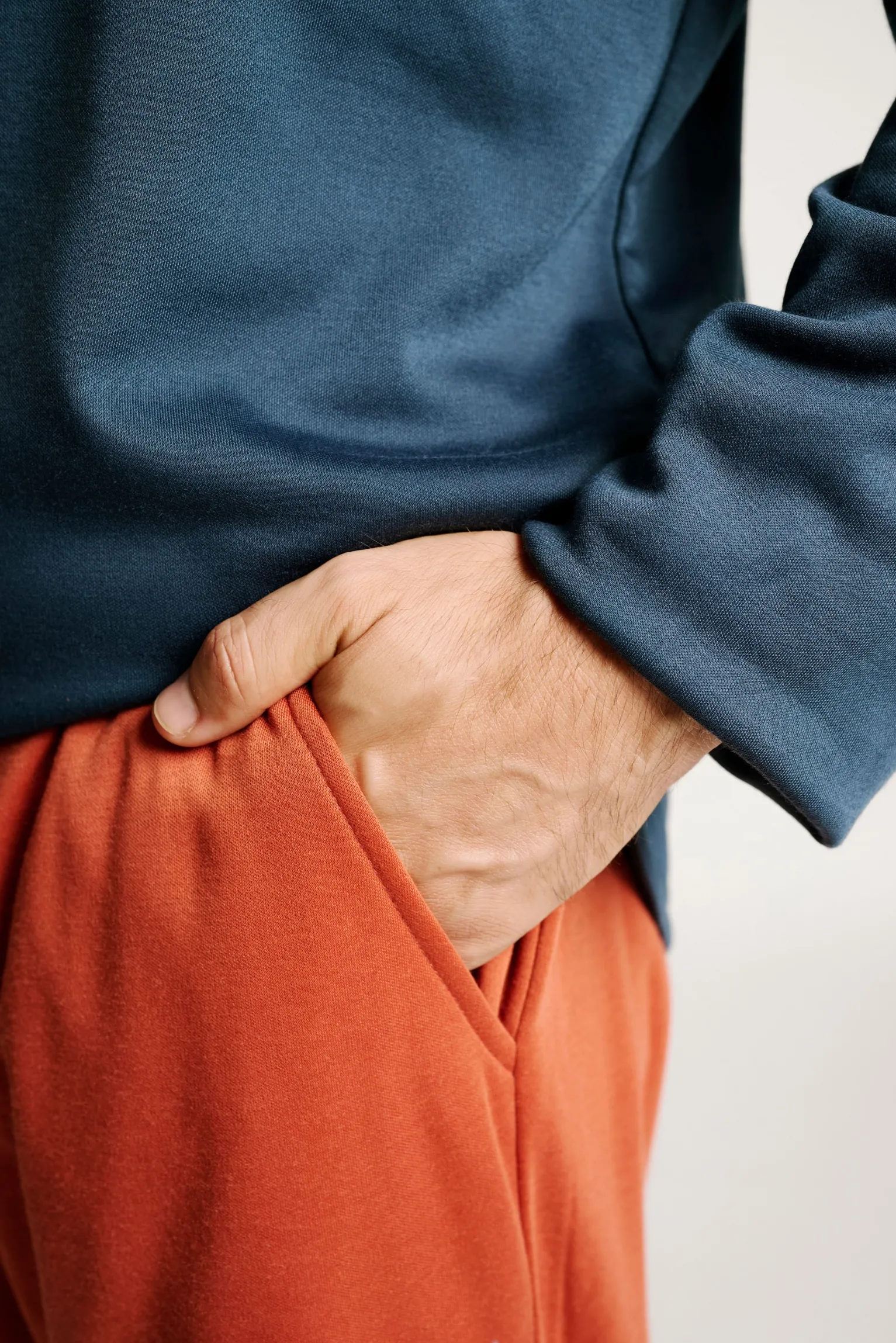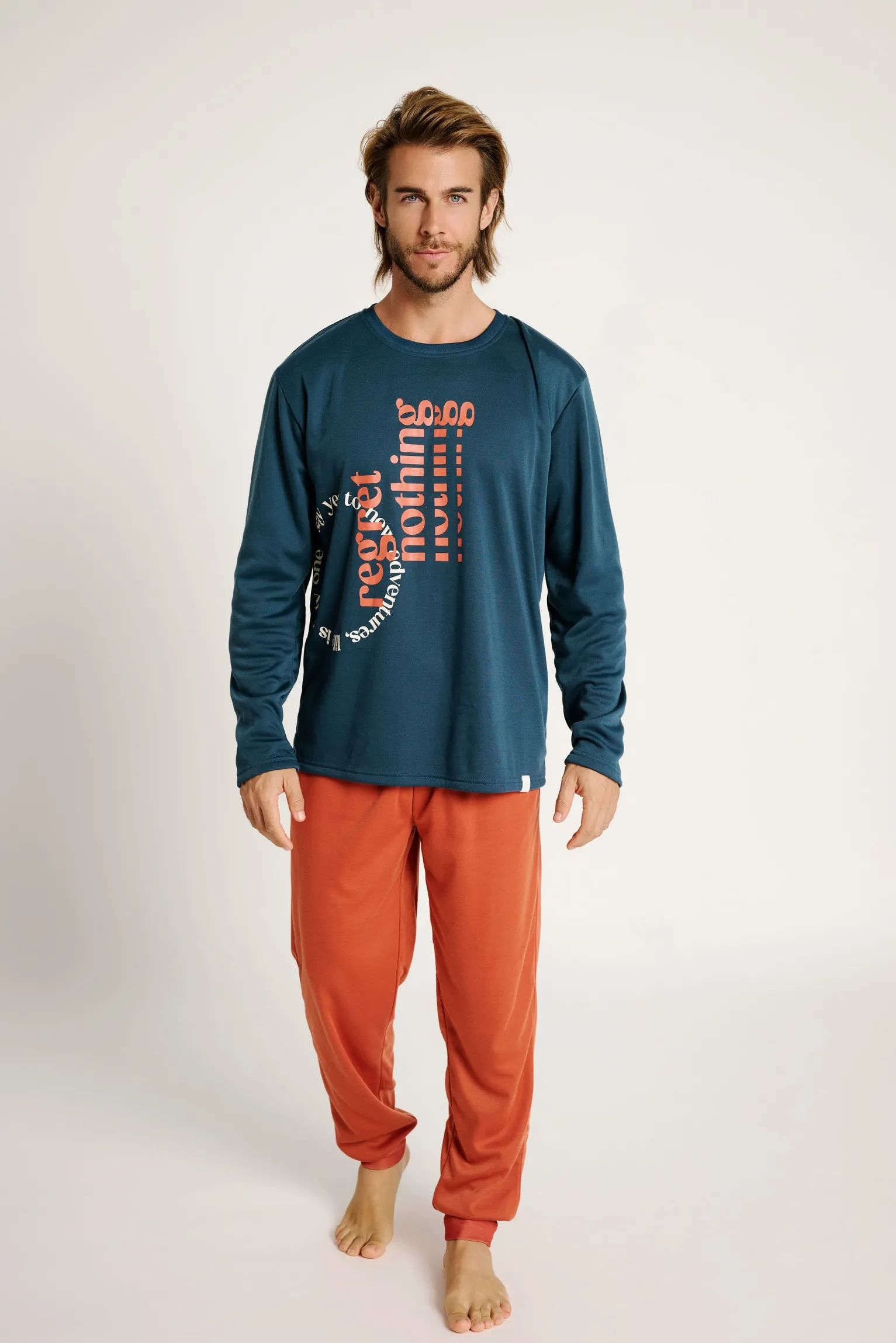 Este pijama largo de hombre combina estilo y comodidad con un toque inspirador. La camiseta azul marino destaca por un original estampado tipográfico en tonos naranjas y blancos con el mensaje “Regret nothing”, ideal para quienes viven con actitud positiva. El pantalón en un cálido tono teja, cuenta con bolsillos laterales. Perfecto para descansar con estilo y energía.