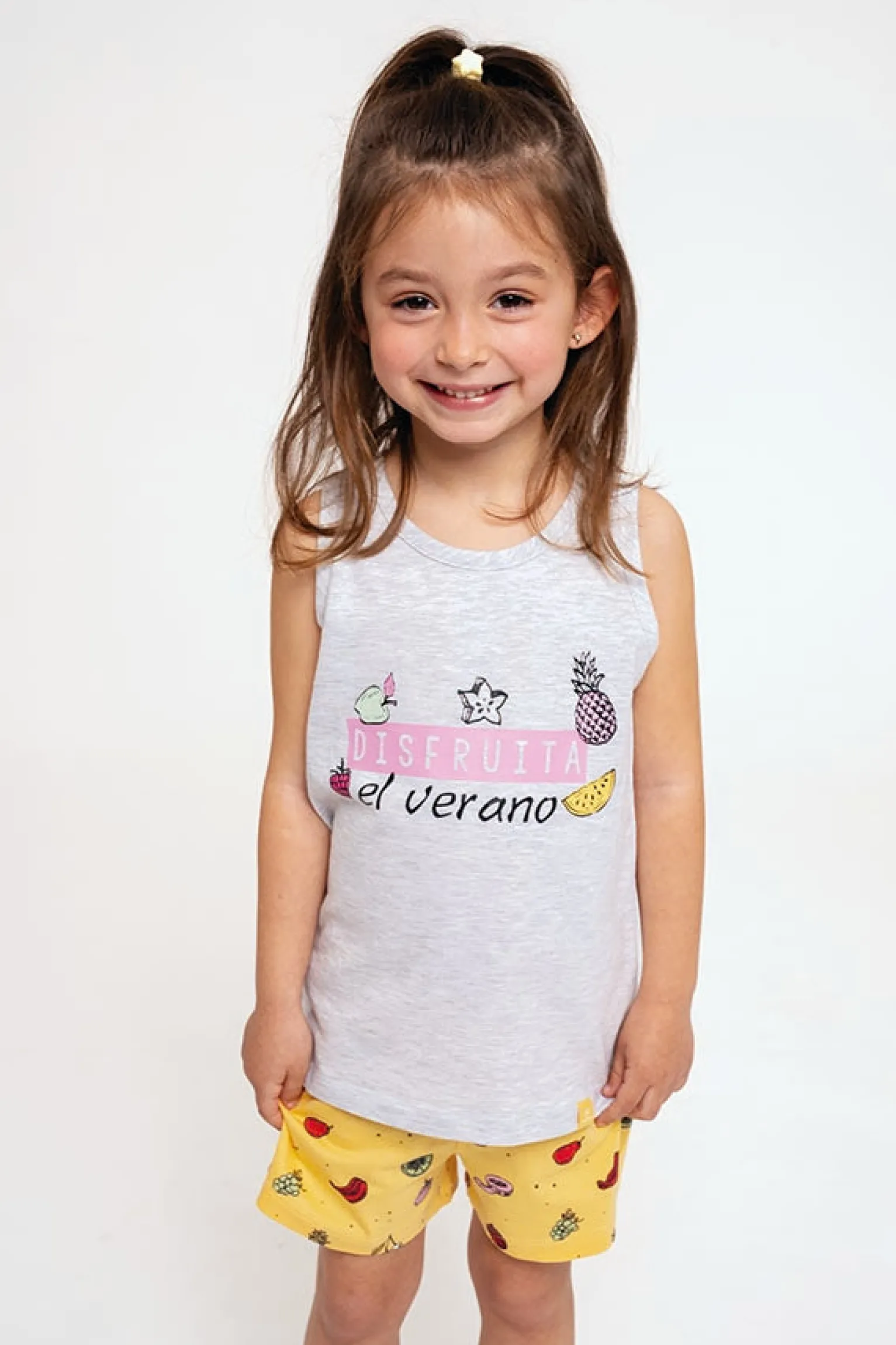 Conjunto de pijama compuesto con estampado divertido de frutas. Camiseta larga de tirantes anchos con mensaje «Disfruita del verano». Pantalón corto estampado con bolsillos y cordón ajustable. Modelo disponible también para adulto.