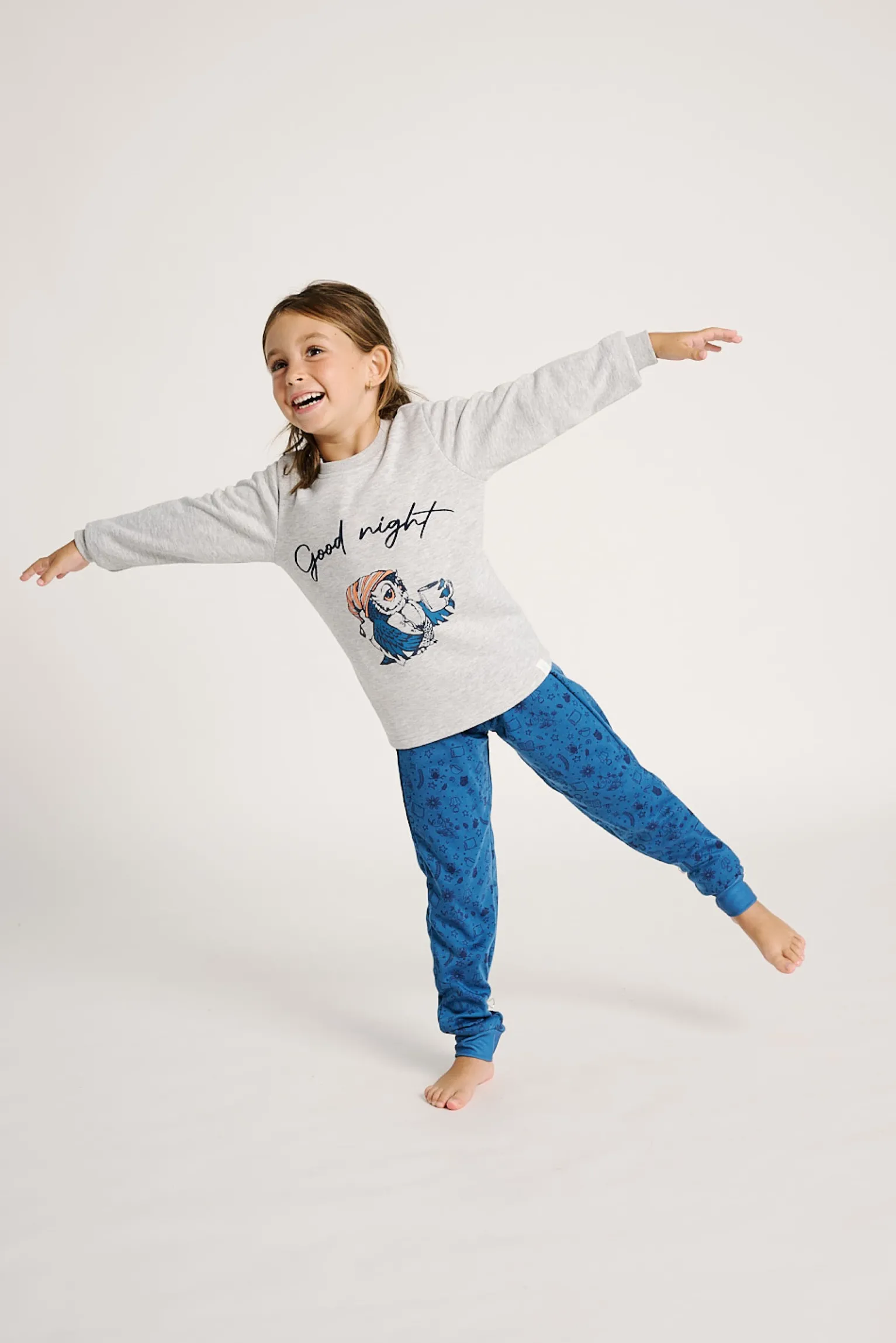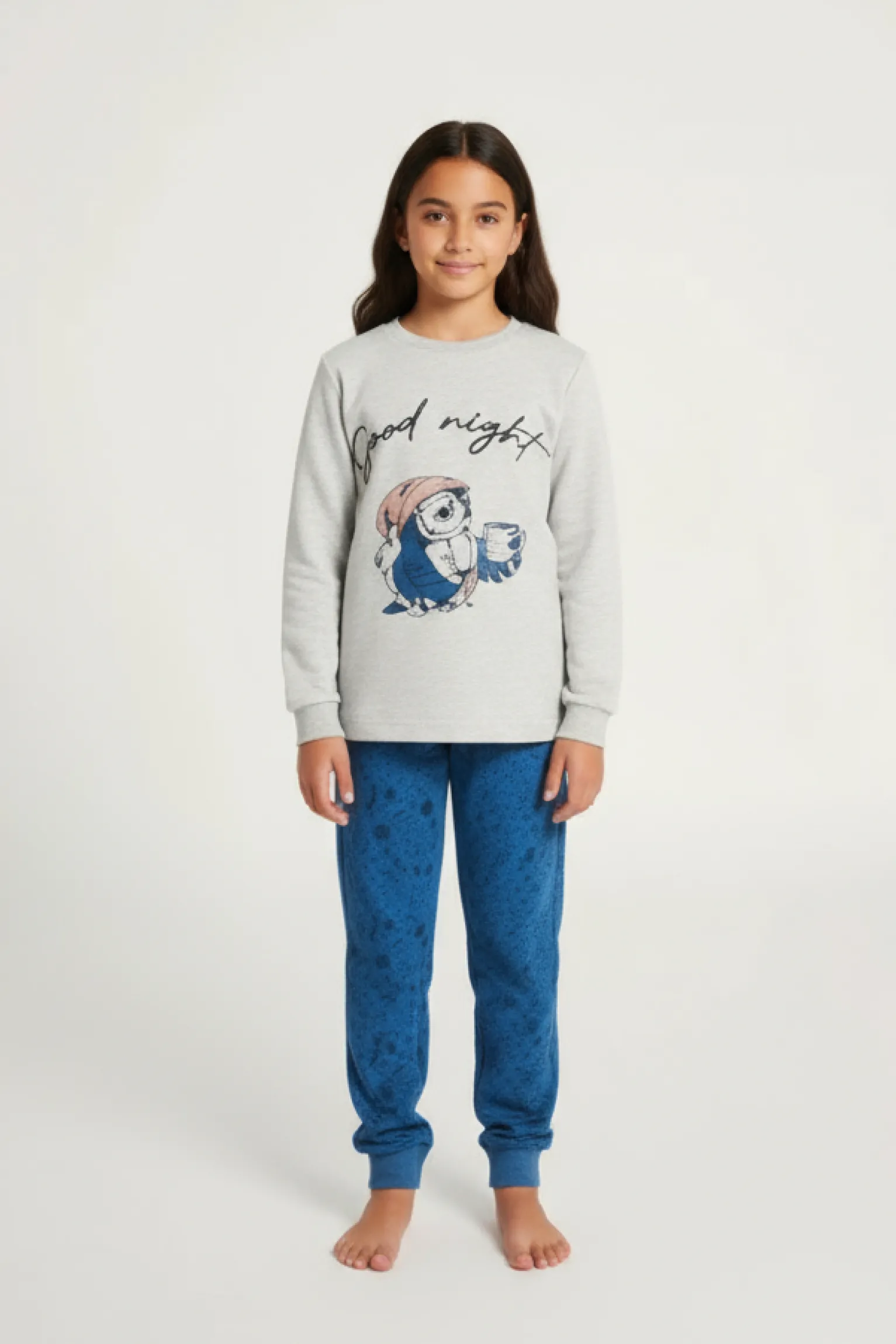 Pijama juvenil de manga larga confeccionado en suave algodón. Camiseta gris con ilustración de búho y texto “Good night” en tono azul, combinada con pantalón azul de estampado discreto y cinturilla elástica para un ajuste cómodo. Ideal para noches de descanso con calidez y estilo.