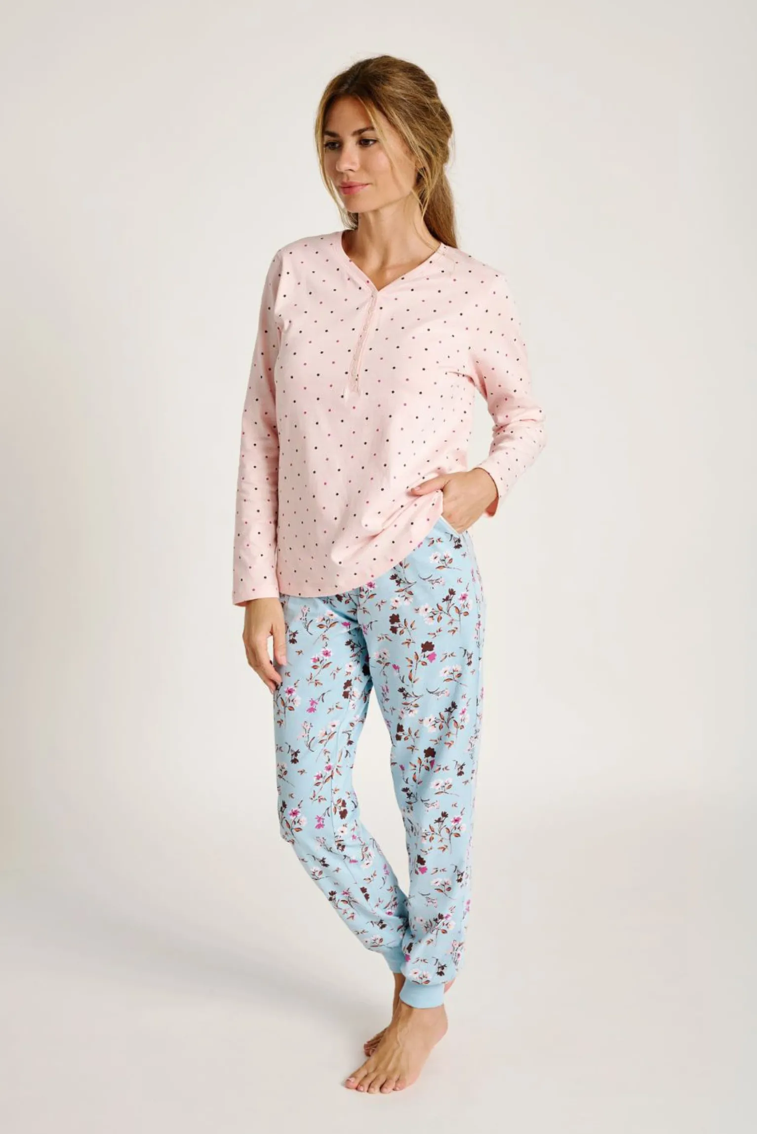 Pijama de dos piezas en suave tejido de algodón. Camiseta rosa de manga larga con cuello redondo y lunares estampados. Pantalón largo celeste con estampado floral, cinturilla elástica y ajuste cómodo para el descanso.