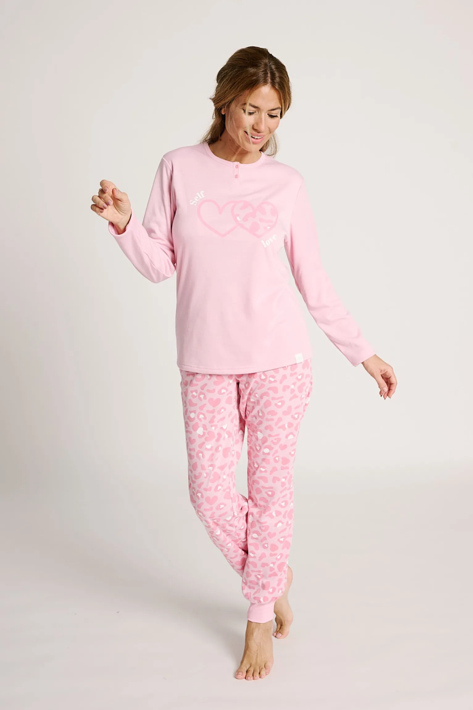 Pijama de dos piezas en suave algodón. Camiseta rosa de manga larga con cuello redondo, detalle de corazones en el pecho y cierre con pequeño botón. Pantalón largo con estampado animal print en tonos rosa y blanco, cintura elástica y puños ajustados para mayor comodidad.