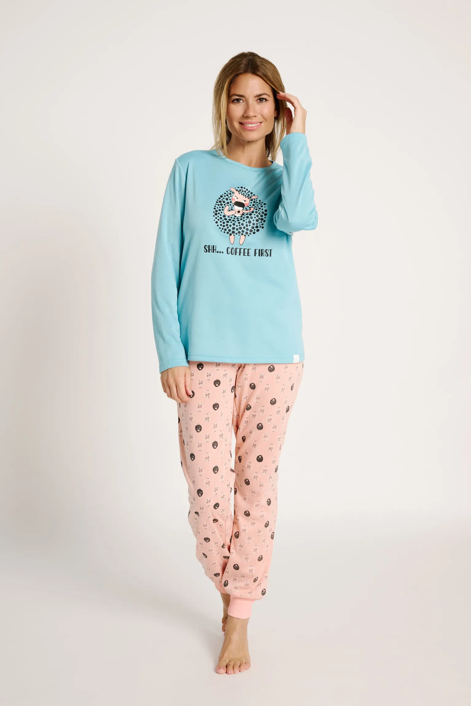 Pijama de manga larga en suave algodón, con camiseta azul celeste y estampado central con frase “Shh… Coffee First”. Pantalón rosa con cintura elástica y divertido estampado de ovejas. Ajuste en tobillos para mayor comodidad, tipo jogger.