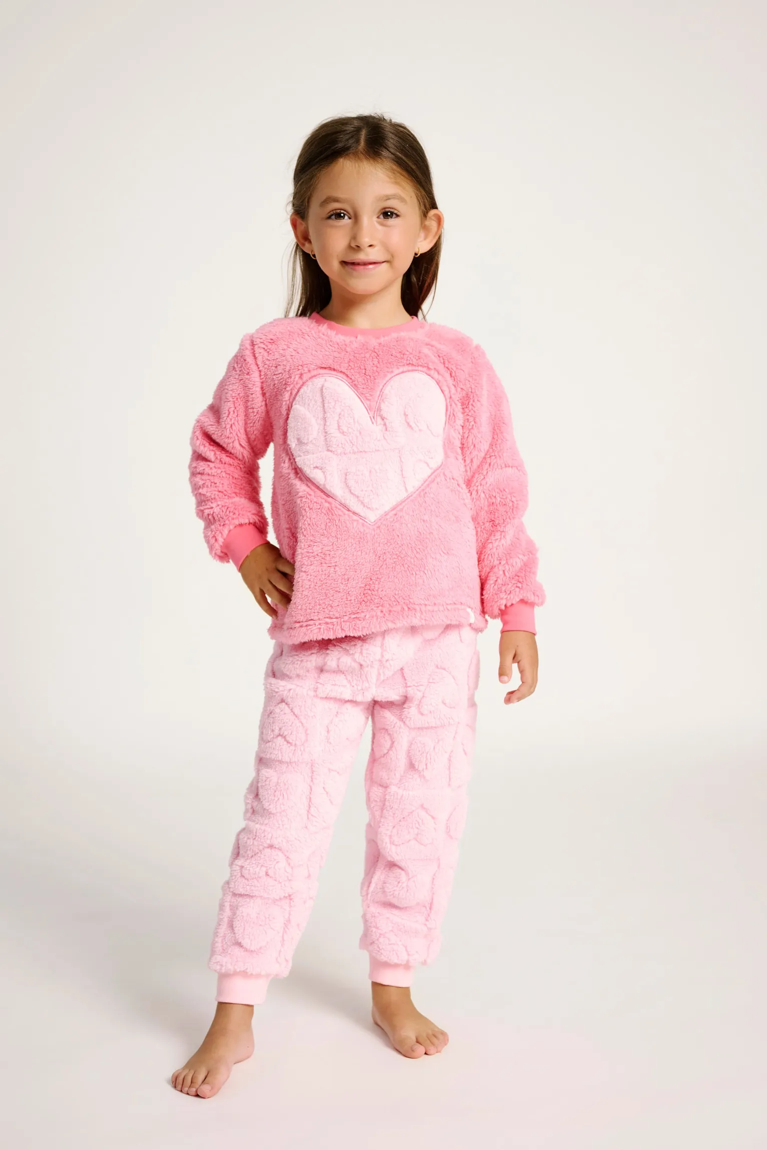 Conjunto de pijama para niña confeccionado en suave tejido polar de tacto aterciopelado, ideal para las noches más frías. La sudadera de manga larga destaca por un gran corazón aplicado en el centro, mientras que el pantalón presenta un divertido relieve de corazones a juego. Diseño cálido y cómodo, perfecto para dormir o disfrutar en casa con estilo y confort.