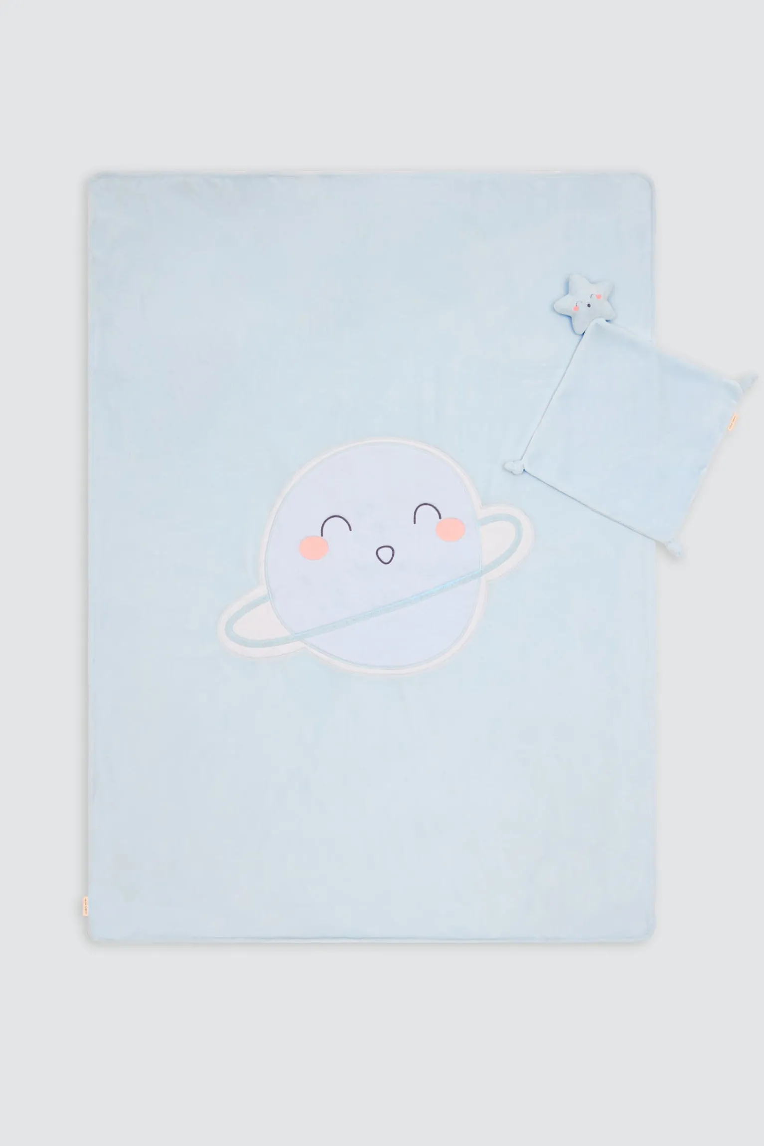Pack para bebé formado por una manta suave y doudou a juego en tonos azules con diseño de planetas. Ideal como regalo para recién nacidos. Aporta suavidad, abrigo y ternura desde el primer día.