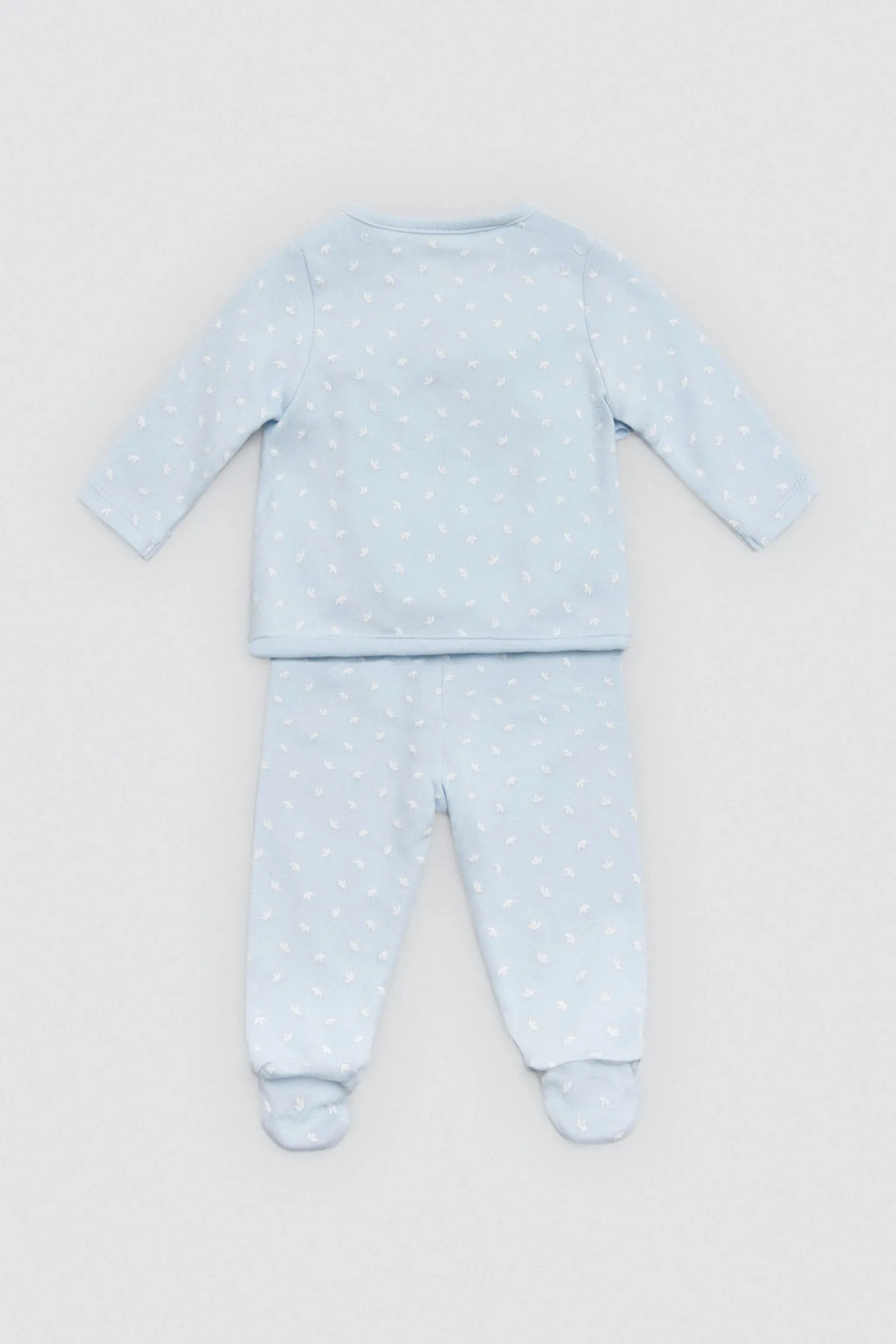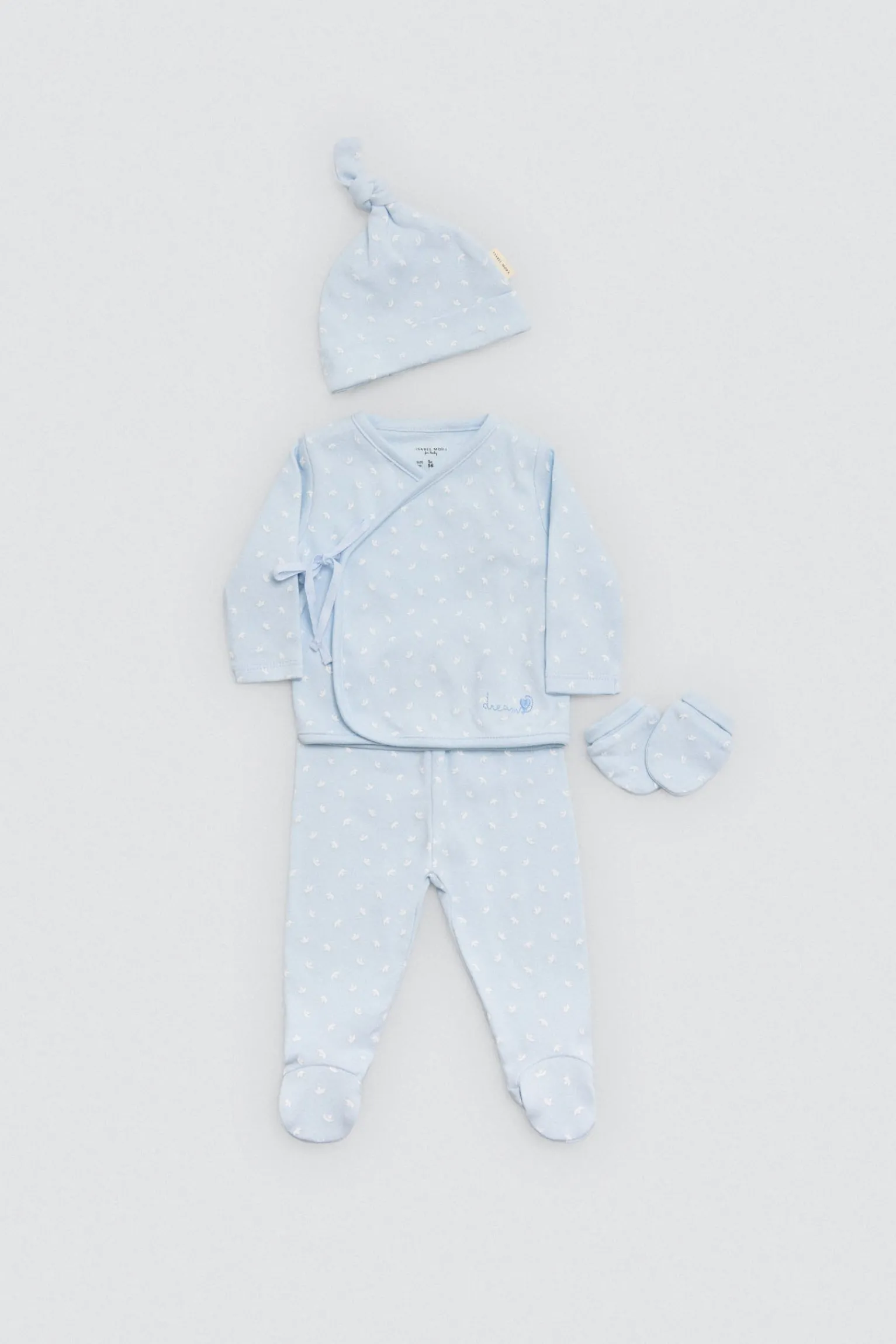 Conjunto completo para la primera puesta del bebé niño. Compuesto por 4 piezas: camiseta cruzada, polaina, gorro con nudo y manoplas. Fabricado en algodón natural, ideal para los primeros días por su suavidad y calidez.