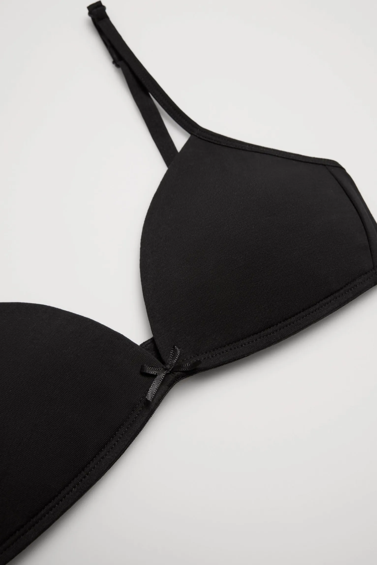 Confeccionado con un suave y transpirable algodón, este sujetador de copa pequeña en forma de triángulo te brinda una sensación de frescura y suavidad en tu piel durante todo el día. Su relleno ligero realza sutilmente tus formas naturales, proporcionándote un look natural y favorecedor.