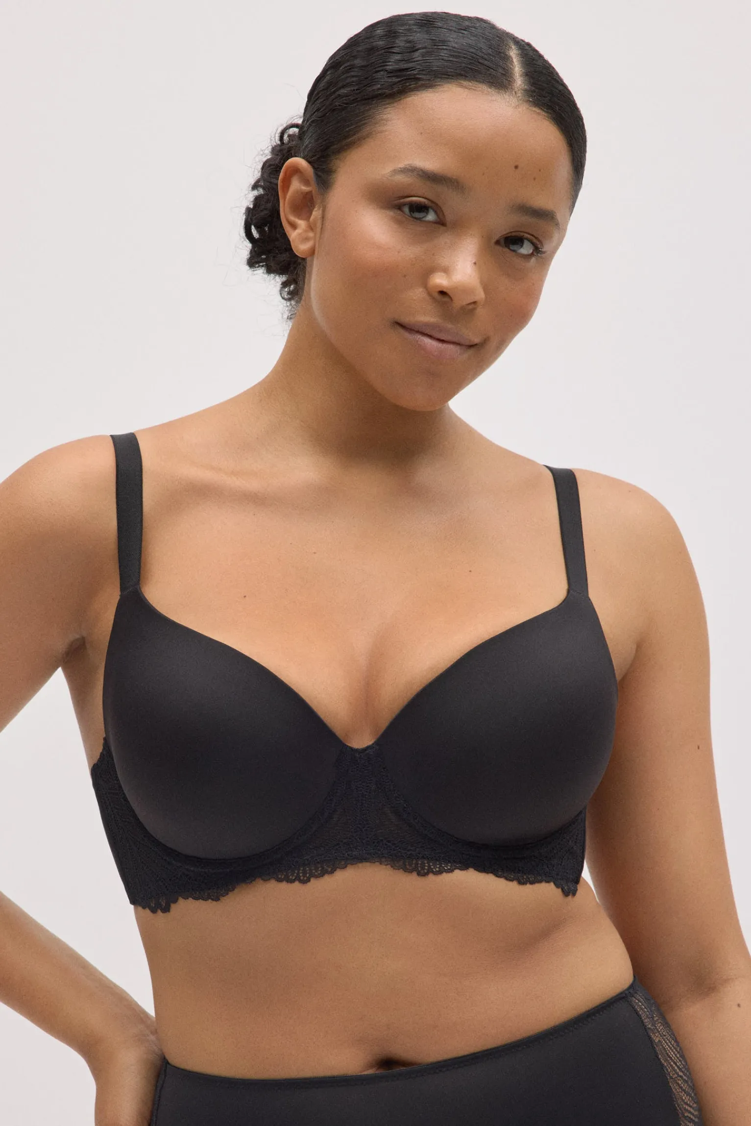 Sujetador con aro y relleno que combina un acabado liso en las copas con un delicado detalle de encaje en el contorno. Su diseño en color negro ofrece un estilo elegante y muy favorecedor, perfecto para el día a día o para completar un conjunto de lencería especial.