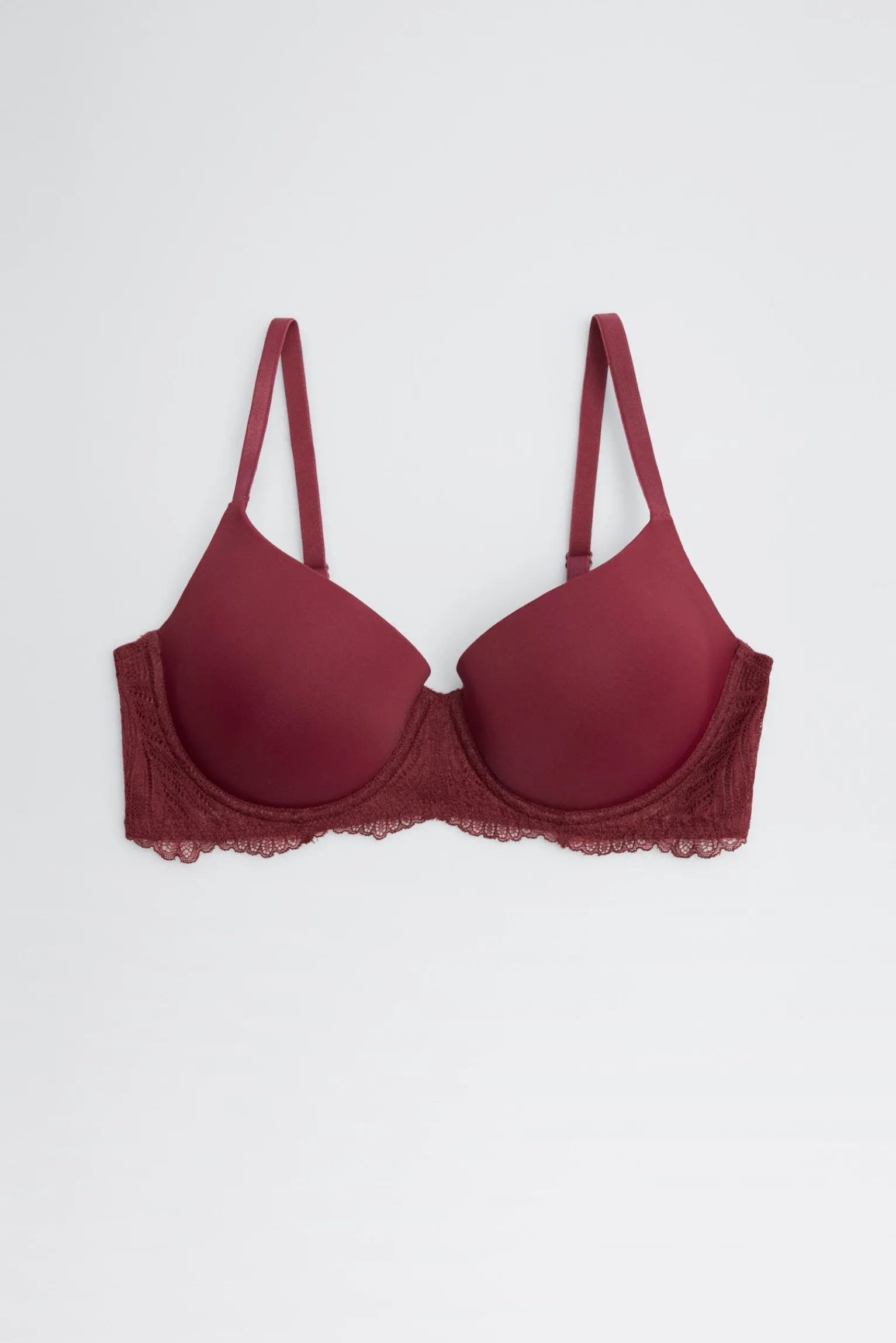 Sujetador con aro y relleno que combina un acabado liso en las copas con un delicado detalle de encaje en el contorno. Su diseño en color granate ofrece un estilo elegante y muy favorecedor, perfecto para el día a día o para completar un conjunto de lencería especial.