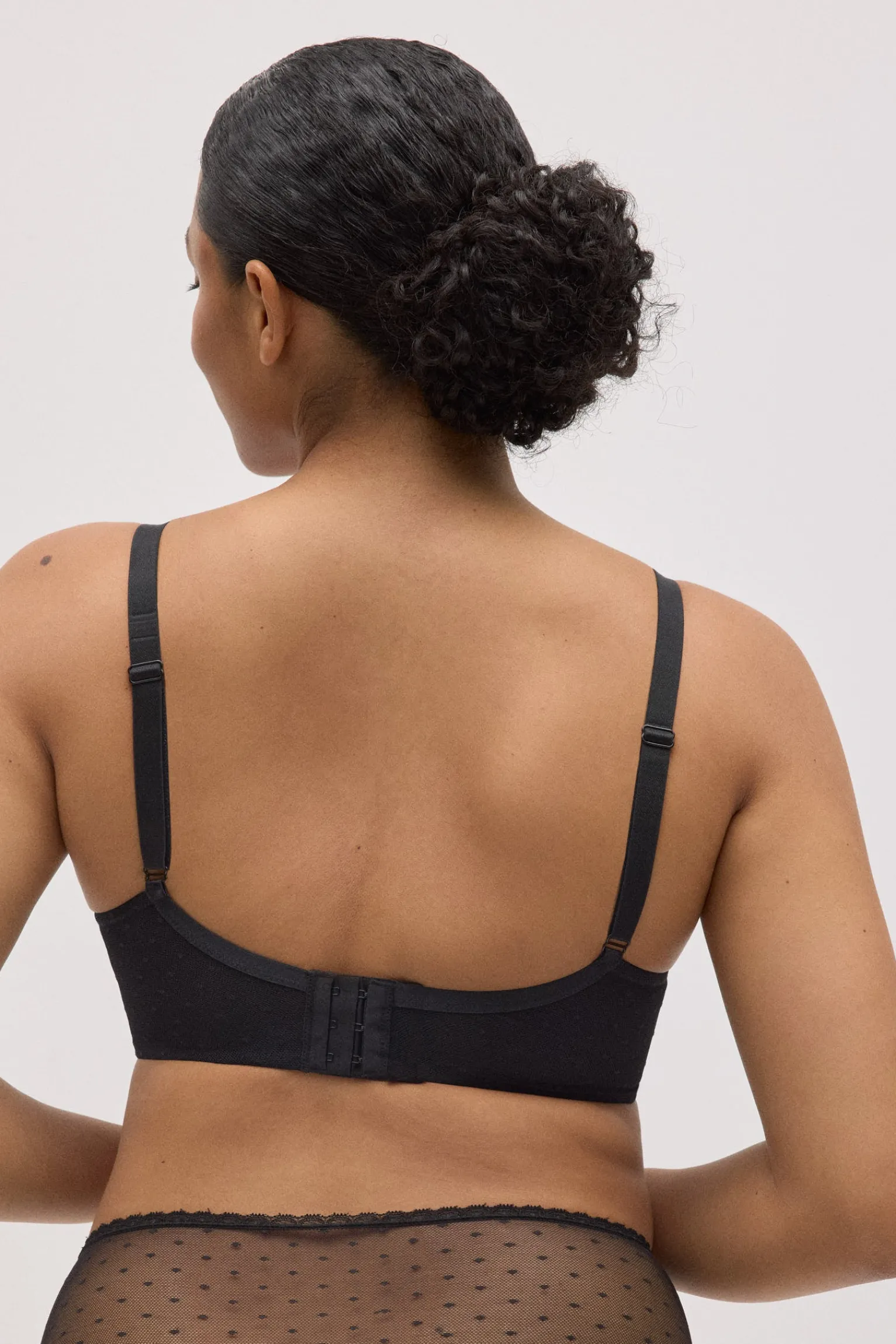 Sujetador de capacidad con aro y relleno que envuelve el pecho y aporta una sujeción excelente en copas C y D. Confeccionado en tejido plumeti con delicados detalles que suman un toque elegante y femenino. En un versátil color negro, perfecto para el día a día.