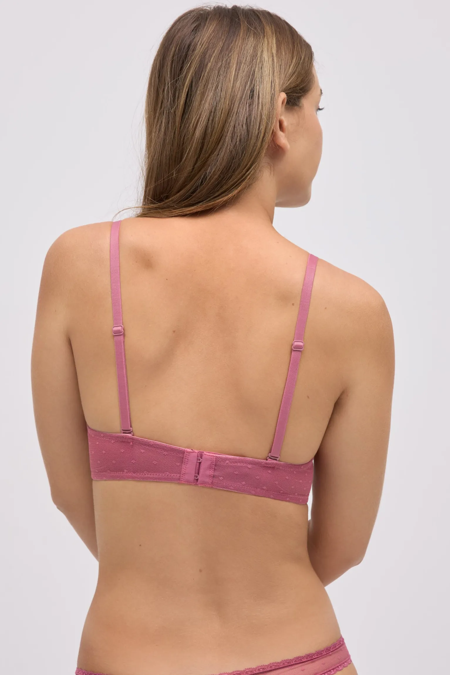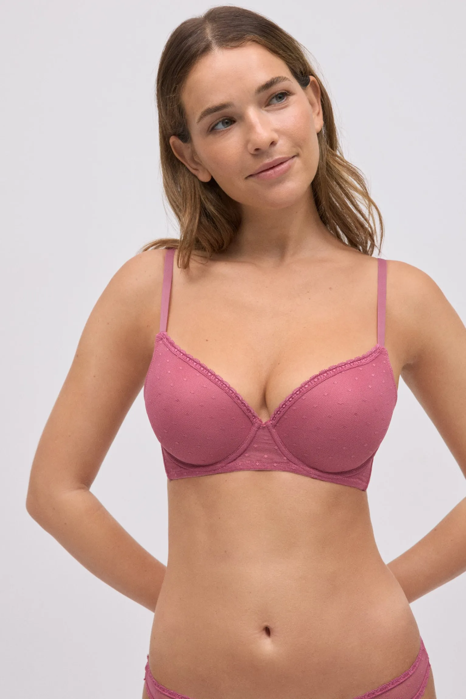 Sujetador push-up con aro que realza y centra el pecho con un efecto visual más voluminoso. Confeccionado en tejido plumeti y delicados detalles de encaje, en un favorecedor tono rosa. Los tirantes multiposición permiten adaptarlo a distintos escotes y espaldas. Combínalo con una braga a juego y crea tu look de lencería perfecto para el día a día o para una ocasión especial.