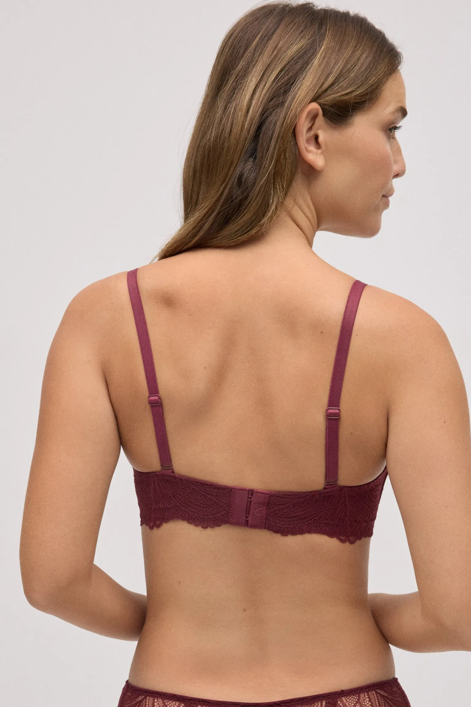 Sujetador sin aro con relleno y encaje color vino