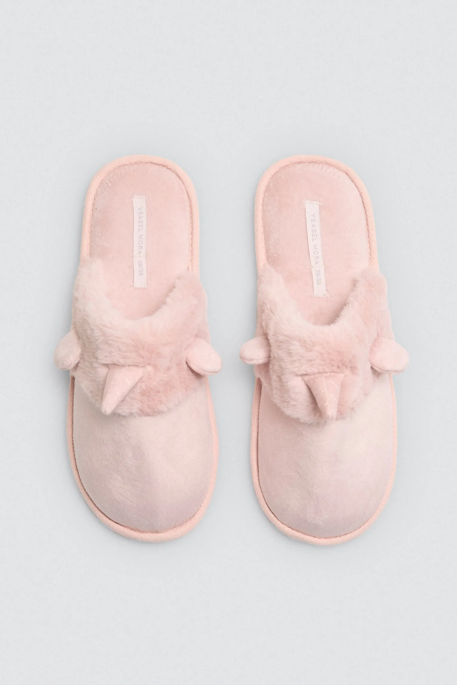 Estas zapatillas de casa de color rosa suave son la combinación perfecta entre confort y ternura. Con detalles de pelo en el borde y pequeñas «orejas» que dan un toque especial, son ideales para mantener tus pies abrigados y cómodos. Su diseño sencillo y femenino las convierte en un must para las tardes de relax.
