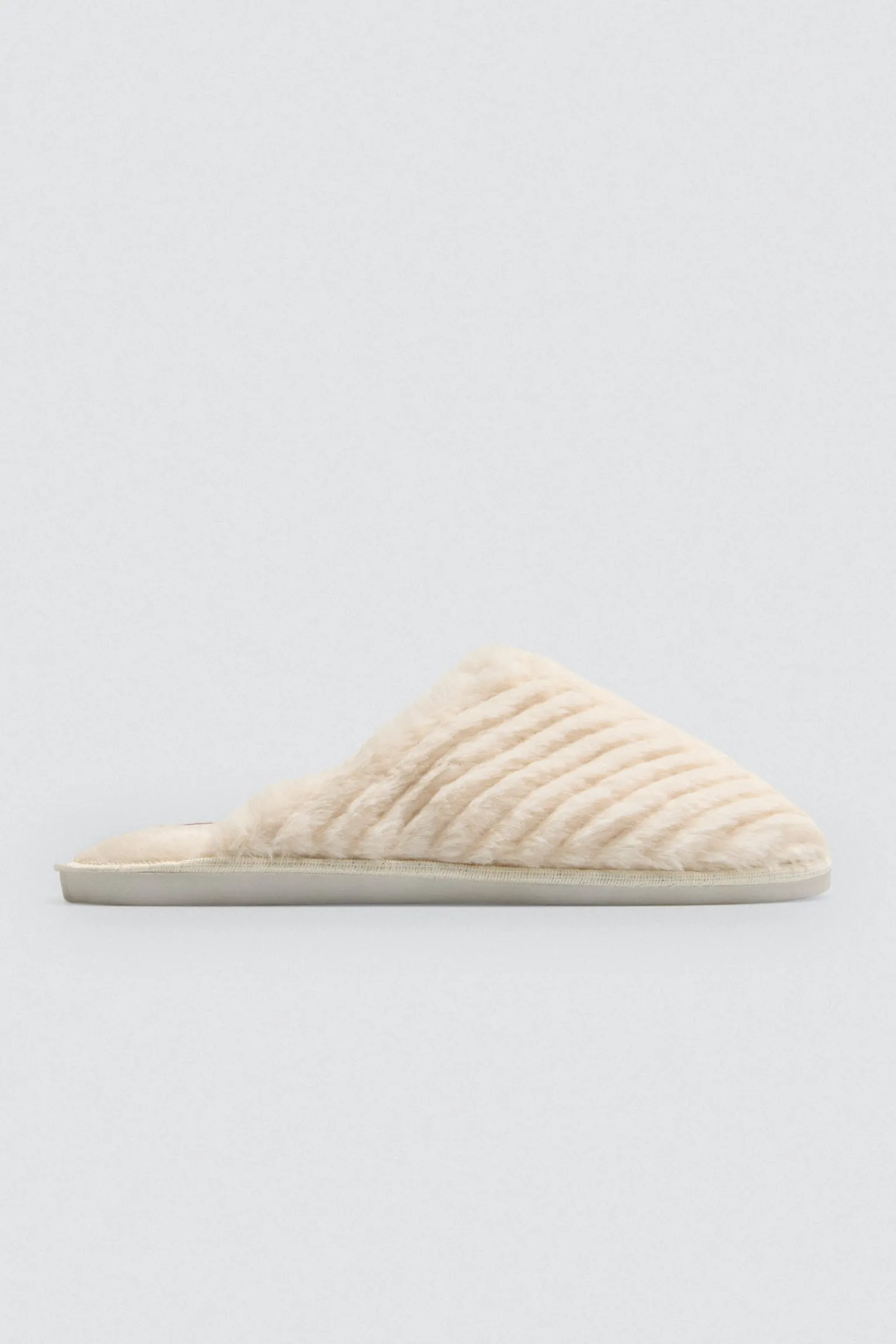 Zapatilla de casa con exterior e interior de pelo efecto canalé en tono crudo.