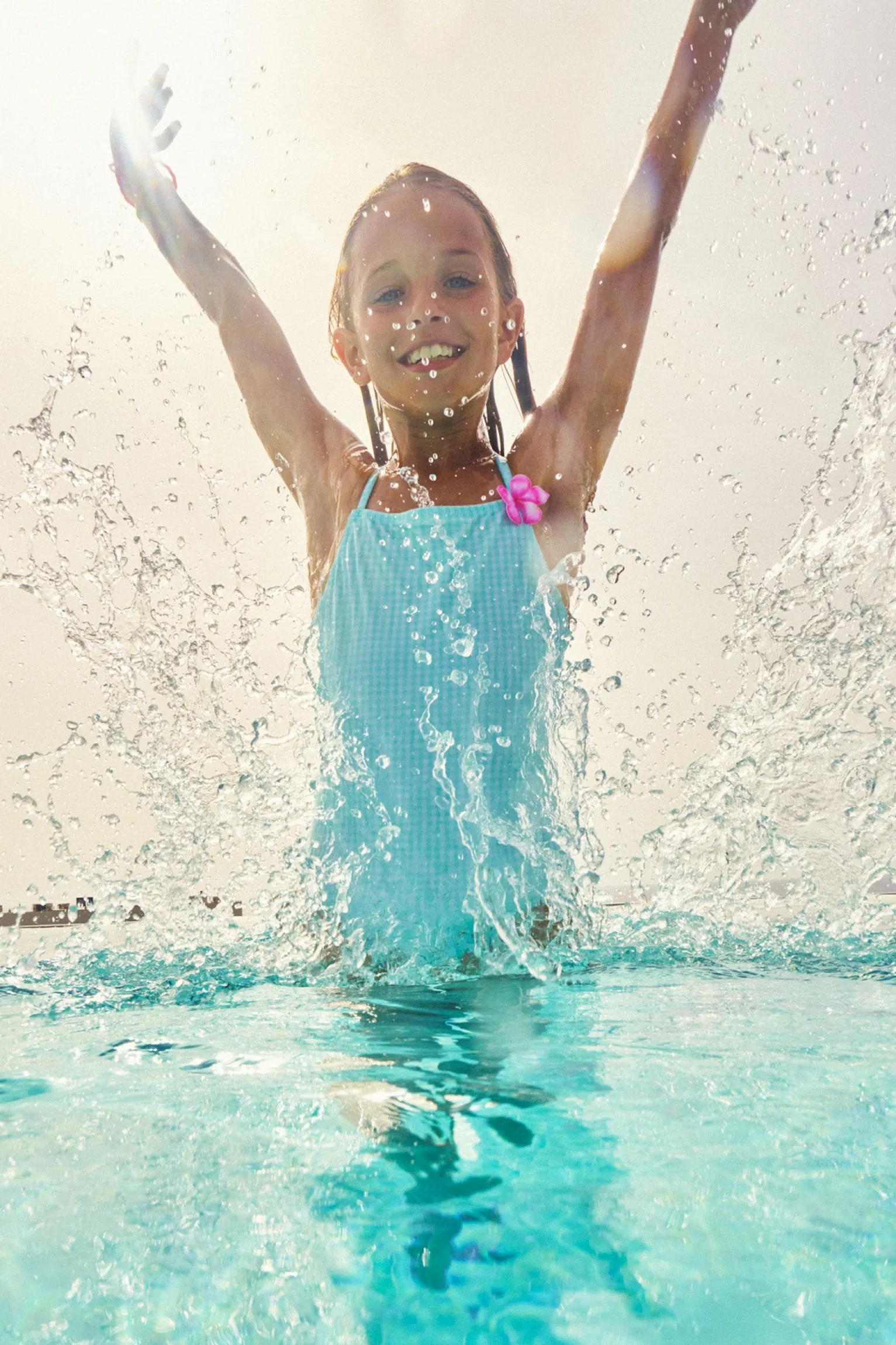 Bañador infantil para niña con estampado vichy. Detalle de flor en 3D en la parte superior.