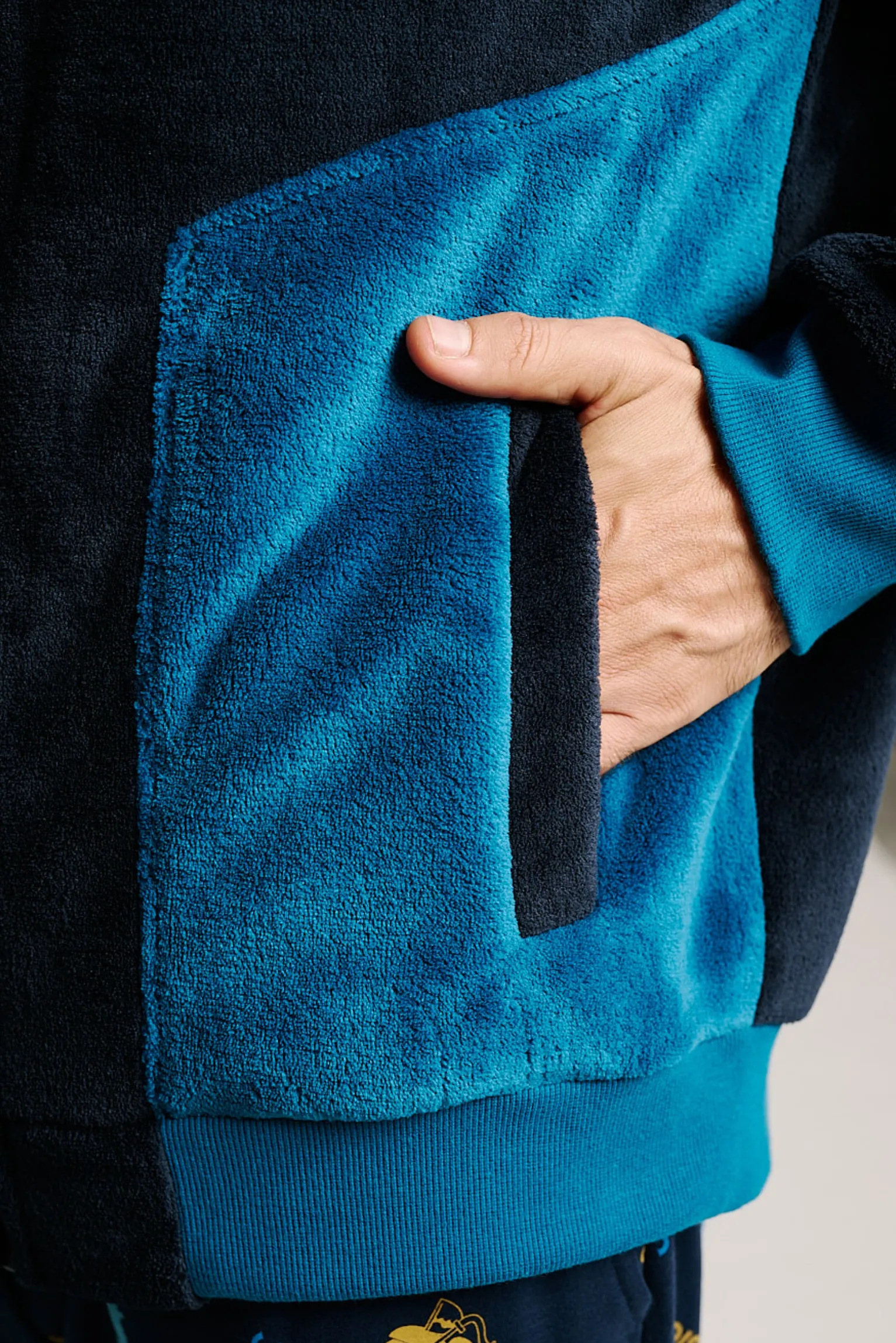 El cuello de borreguito aporta un extra de abrigo y un look moderno y masculino. Incluye cremallera frontal, bolsillos laterales amplios y puños elásticos para un ajuste cómodo y funcional. Ideal para tus momentos de relax en casa.