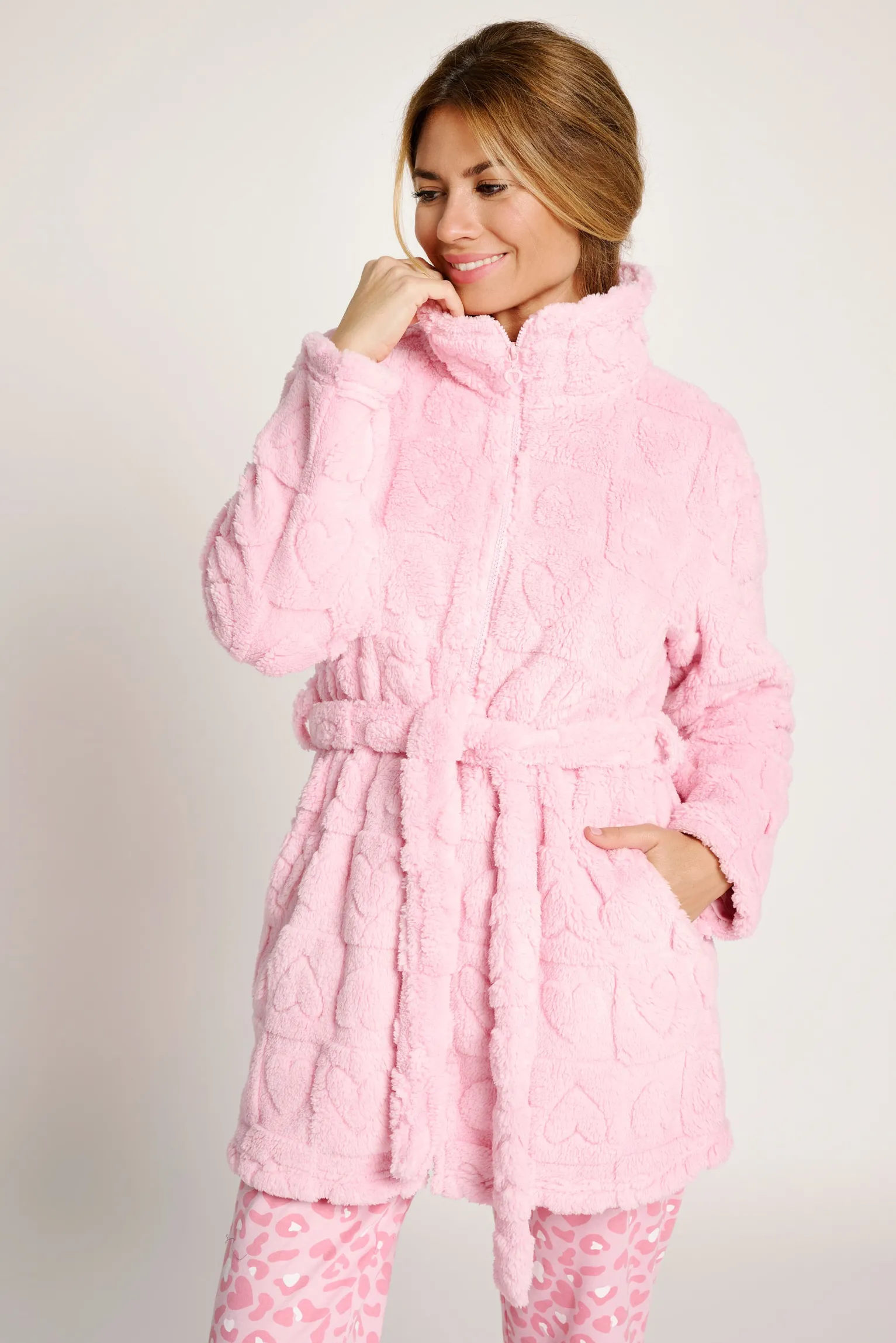 Bata corta de tejido polar ultrasuave con relieve de corazones. Incluye cierre de cremallera y cinturón ajustable para mayor comodidad. Con cuello alto para más abrigo y bolsillos laterales prácticos. Diseño cálido y femenino, ideal para estar en casa en los días fríos.