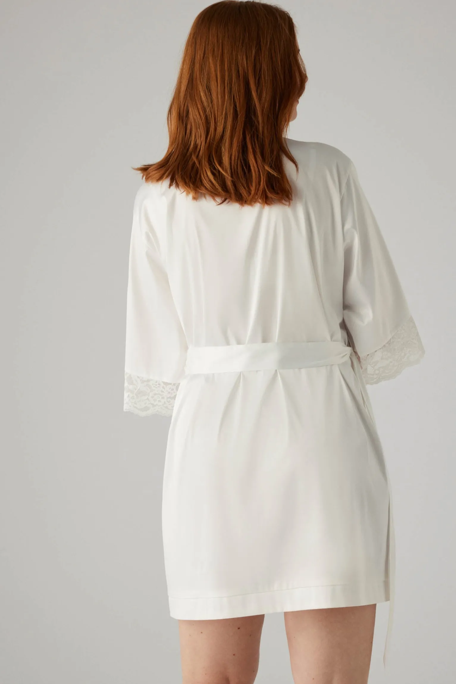 Bata en satén con detalles de encaje, perfecta para novia. Con cinturón y mangas 3/4, es ideal para bodas, ofreciendo elegancia y confort en ese día tan especial.